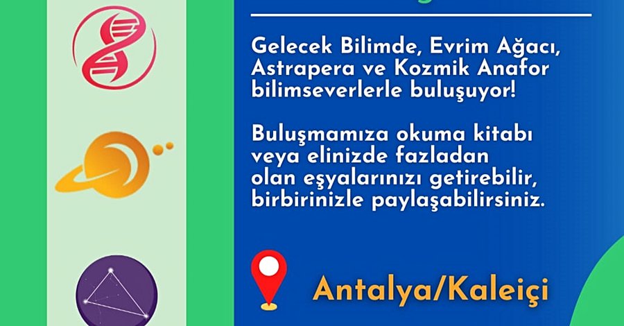 Evrim Ağacı, Gelecek Bilimde, Kozmik Anafor ve Astrapera olarak Antalya'da bir araya geliyoruz! En az 30 kişilik yer ayırdık ve bilimseverlerle buluşmayı dört gözle bekliyoruz. Gelenler arasında: