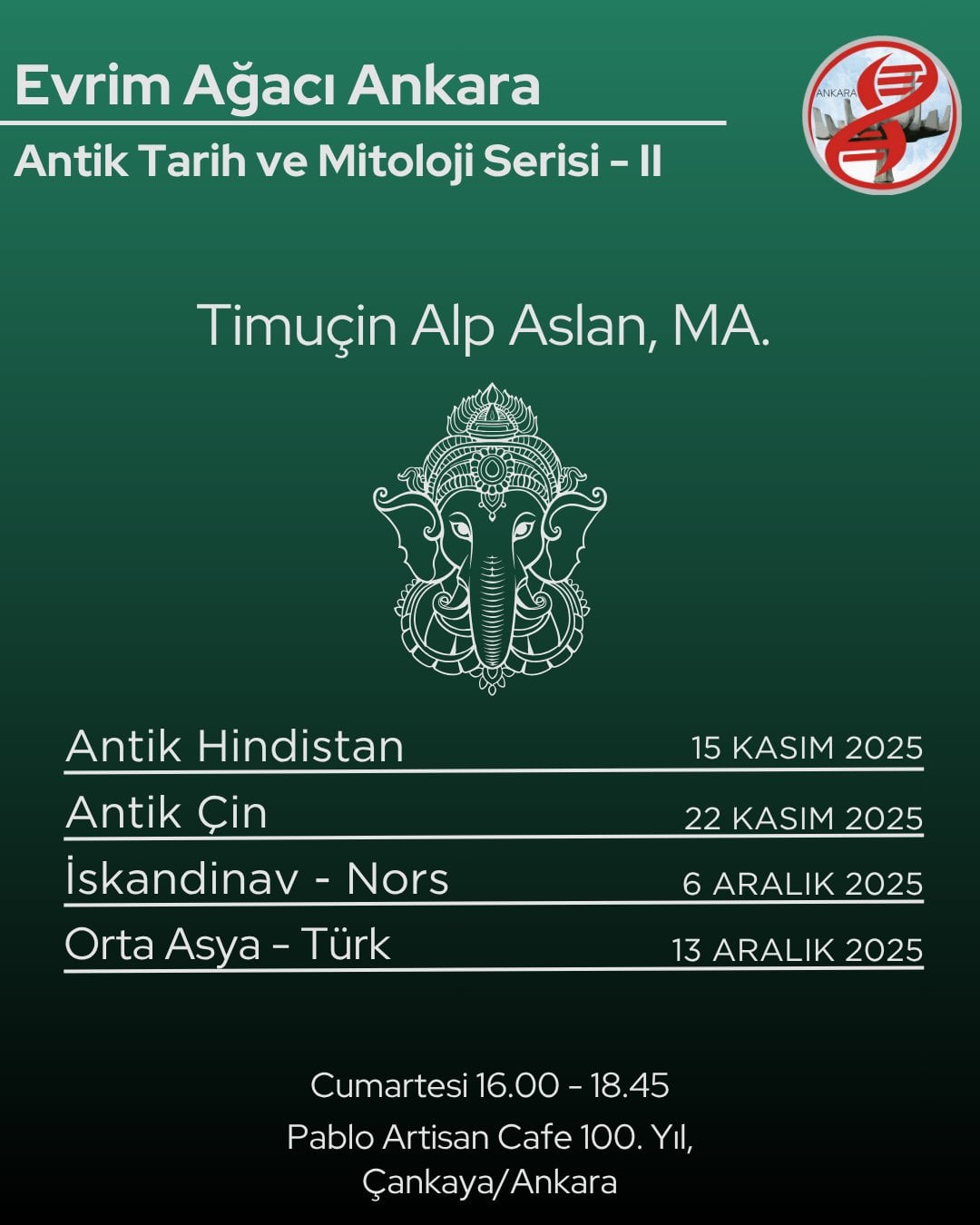 Evrim Ağacı Antik Tarih ve Mitoloji Dersleri, 15 Kasım 2025 tarihinde saat 16.00’da ilk etkinlik ile başlayacaktır. Toplamda 4 etkinlik yapılacaktır ve 4 hafta sürecektir.