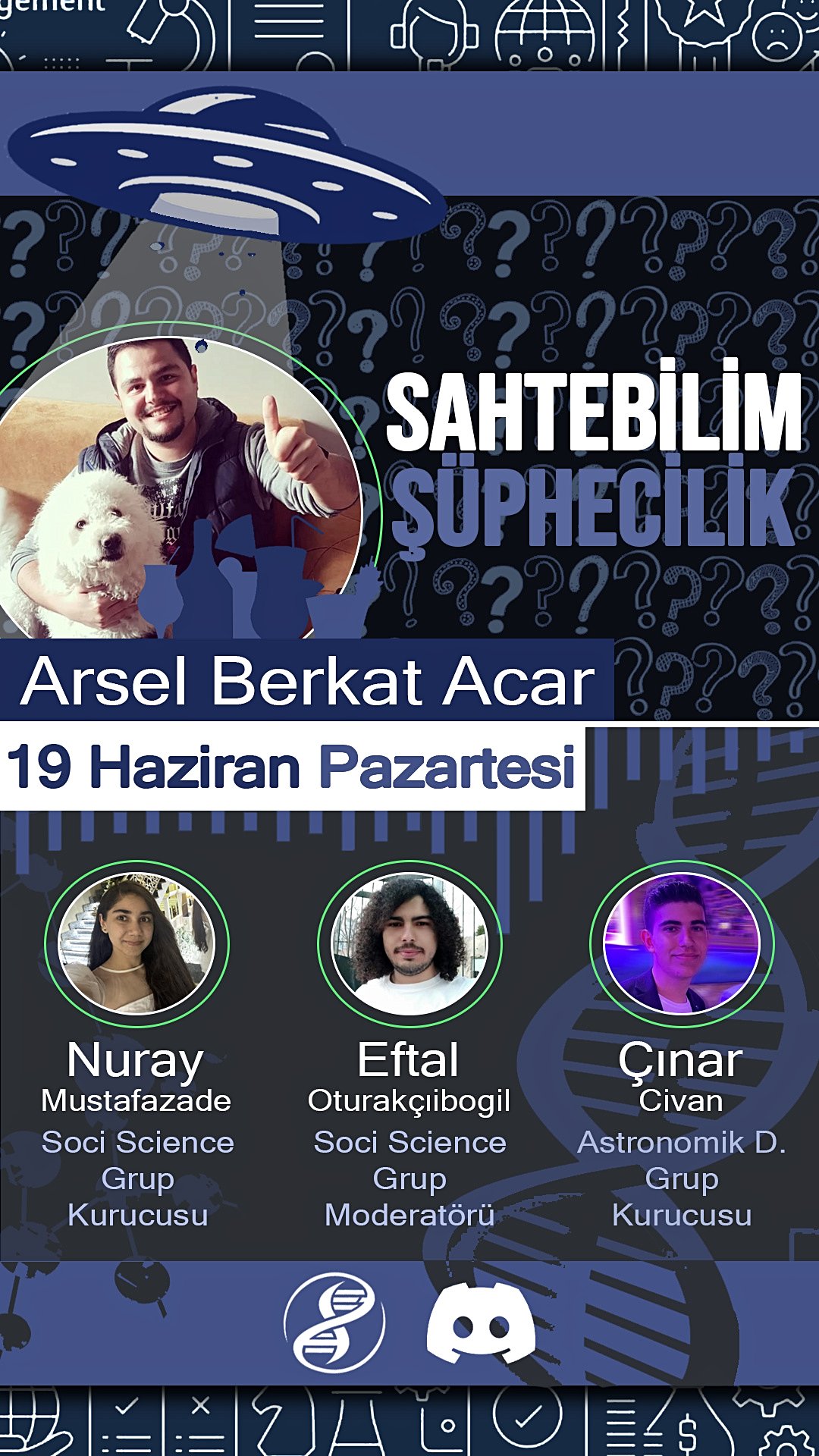 Evrim Ağacı Discord Sunucusu Soci Science ve Astronomik Disiplinler Grupları olarak Şüphecinin El Kitabı'nın eşyazarı ve Evrim Ağacı editörü Arsel Berkat Acar ile sahtebilim ve şüphecilik üzerine 19.06.2023 tarihinde yapacağımız etkinliğe hepiniz davetlisiniz.