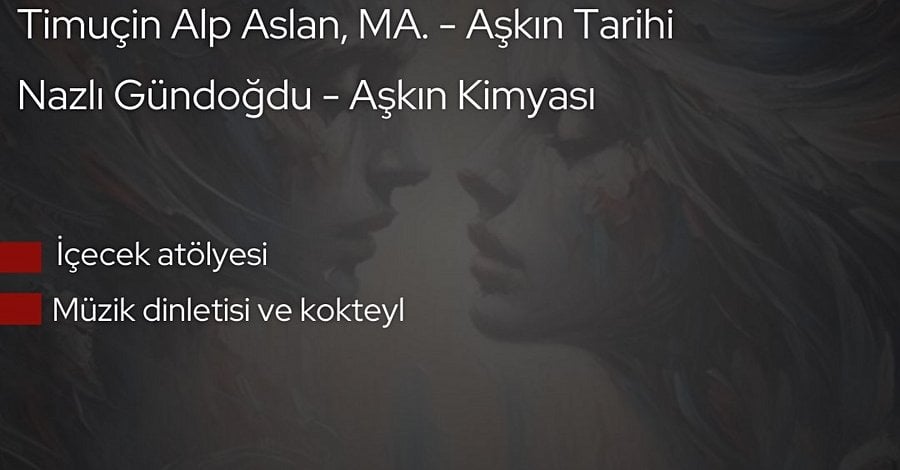 Aşkın Evrimi etkinliğimiz 22 Şubat 2026 tarihinde saat 14.00’da başlayacaktır. Etkinliğimizde Aşk kavramının bilimsel olarak inceleneceği 45 dakikalık 3 ayrı sunum yapılacaktır. Sunumların ardından sıcak üzümlü içecek sunumu, tadımı ve kokteyl yapılacaktır.