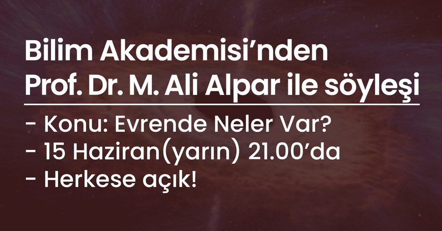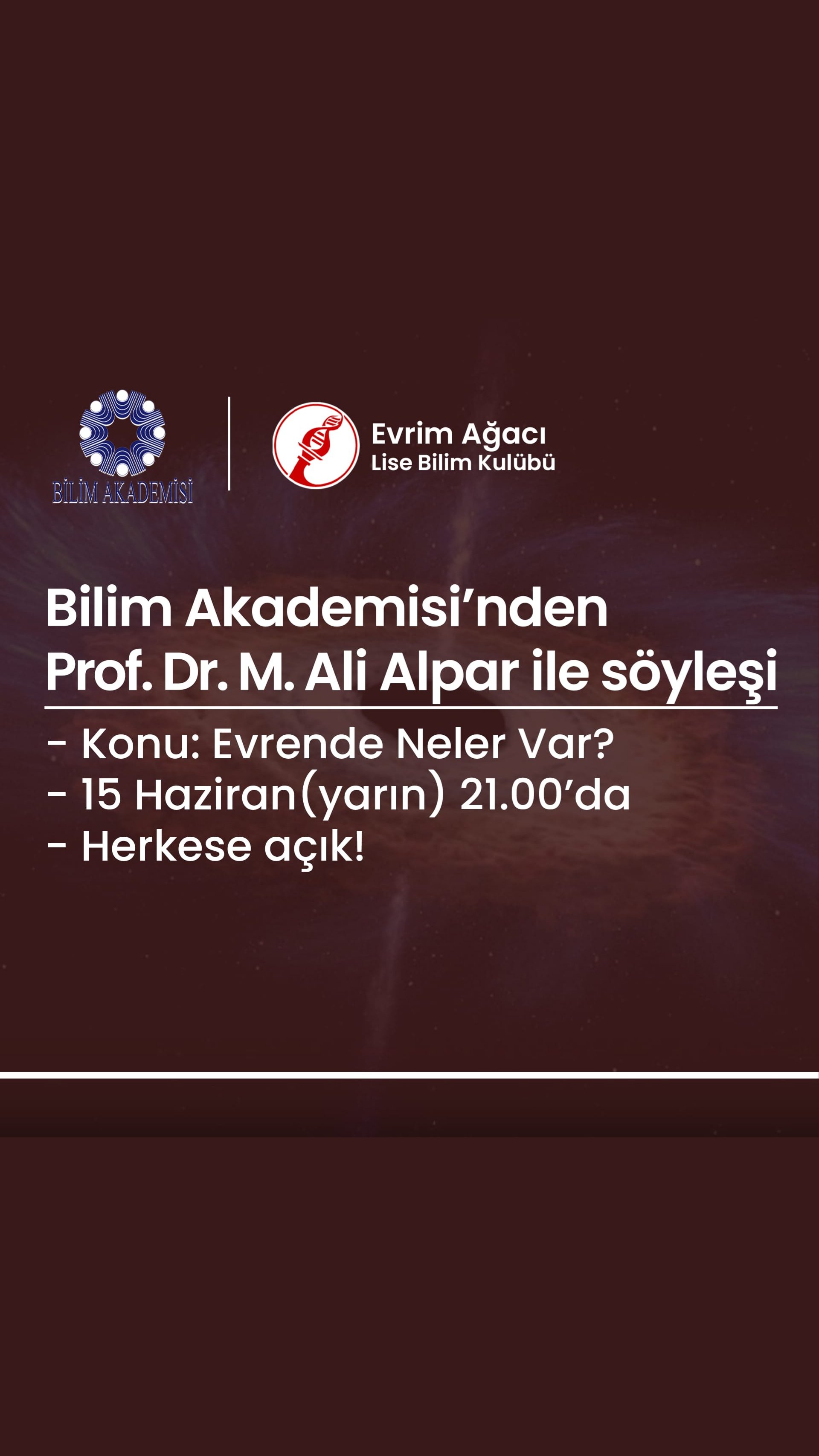 Evrim Ağacı Lise Bilim Kulübü olarak 15 Mayıs Pazar günü 21.00'da Türk astrofizikçi ve Bilim Akademisi kurucu üyelerinden Mehmet Ali Alpar ile yapacağımız söyleşiye katılmak için aşağıdaki linkten formu doldurabilirsiniz!🥳