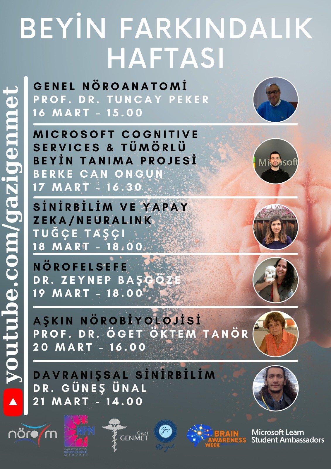 Nörobilim ve Nöroteknoloji Mükemmeliyet Merkezi(NÖROM) ve Gazi Üniversitesi GENMET Topluluğu tarafından düzenlenecek olan Beyin Farkındalık Haftası(BAW) 16-21 Mart tarihlerinde pandemi sebebiyle online gerçekleştirilecektir. Etkinliklerimizde multidisipliner bir yaklaşım sergilemeye çalışarak farklı alanlardan birbirinden değerli uzman konuşmacıların katılımıyla nörobilim ve çalışma alanlarını, eğlenceli ve bilimsel şekilde halka anlatmayı ve beyin araştırmaları hakkında farkındalık yaratmayı amaçlamaktayız.