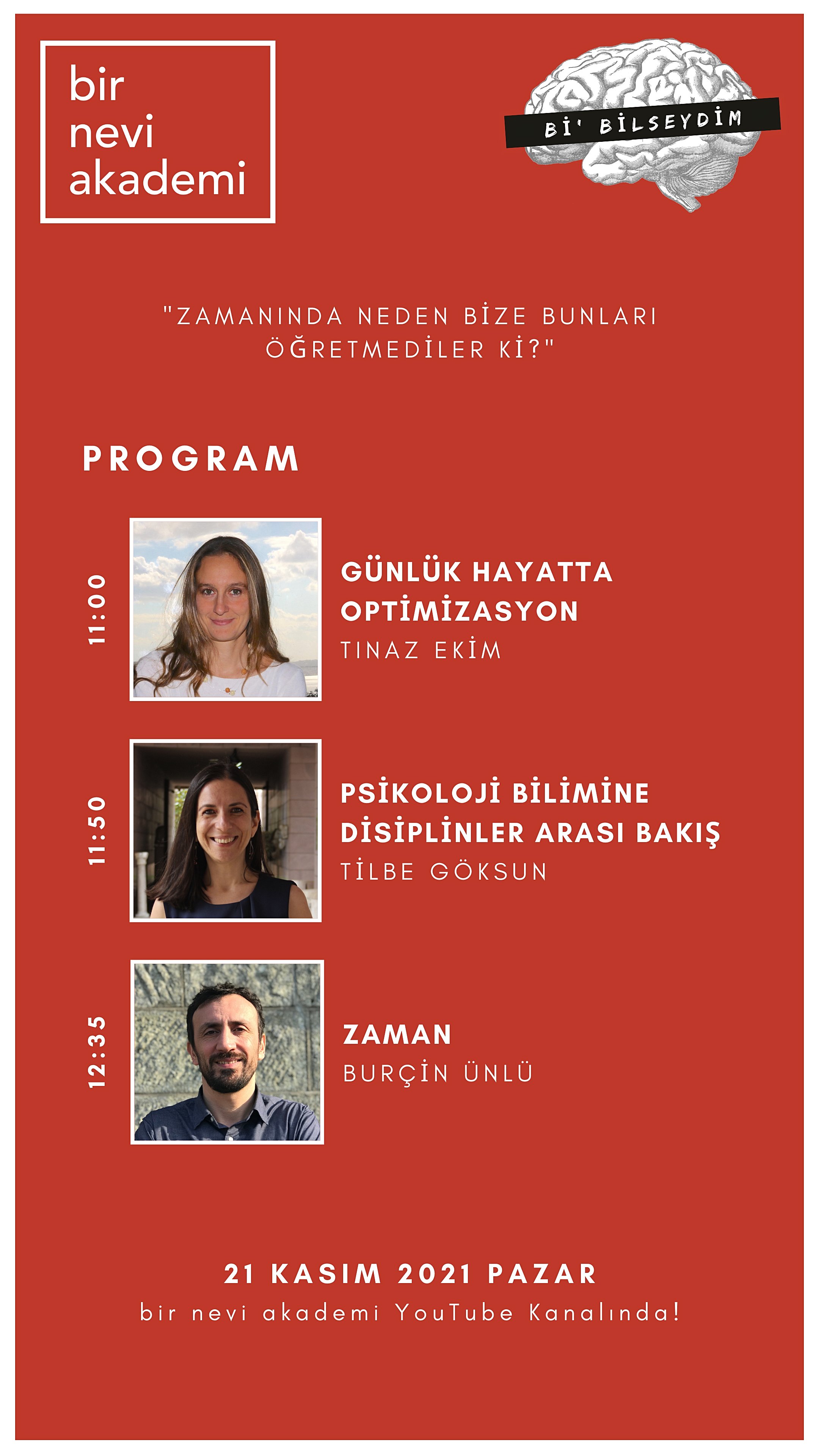 Konferans Youtube üzerinden herkese açık olarak yayınlanacak ve sunumların sonunda chat kısmında konu hakkında sorulmuş soruları konuşmacılarımıza yönelteceğiz. Artık daha az (ya da belki de daha çok) "Bi' Bilseydim" demek için siz de gelin; Tınaz Ekim, Tilbe Göksun ve Burçin Ünlü'nün Bi' Bilseydim dediklerine gelin hep birlikte kulak verelim!