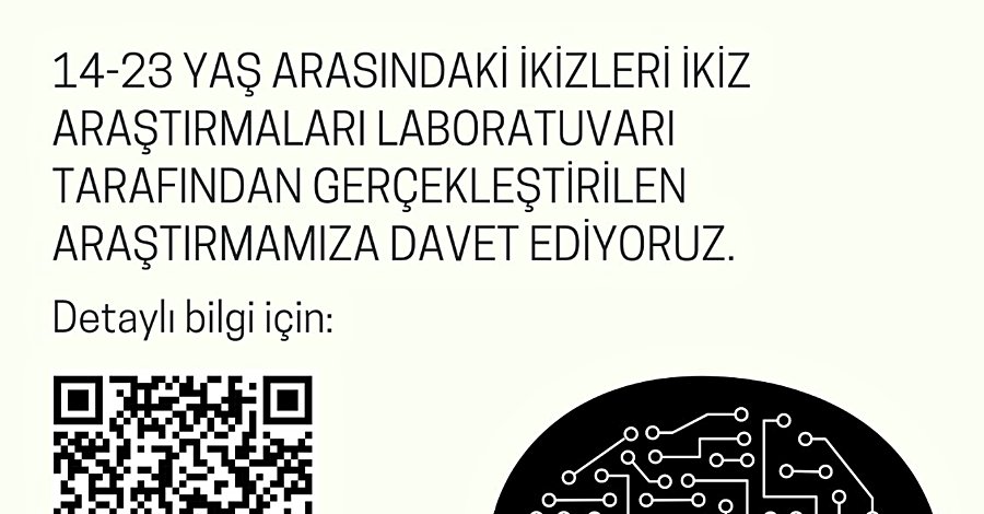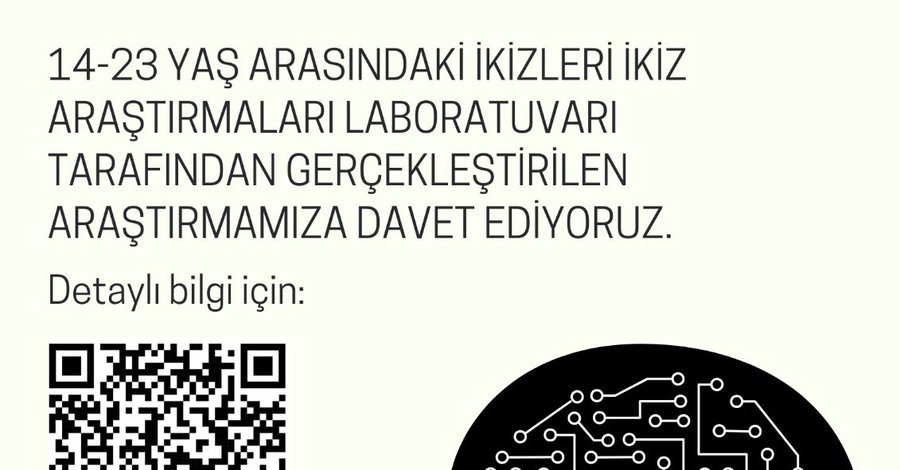 Bilkent Üniversitesi Neuroscience ve Psikoloji bölümü olarak yürüttüğümüz TÜBİTAK projesi için 14-23 yaş arası ikiz katılımcılar arıyoruz. Yaklaşık 3 saat süren ve kampüsümüzde gerçekleştirdiğimiz çalışmanın sonunda katılım sağlayan her bir ikize 300 TL katılım payı ödemesi yapıyoruz.