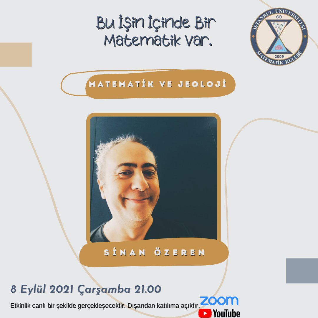 *8 Eylül Çarşamba* günü saat *21.00*’de *Sinan Özeren* ile *Matematik ve Jeoloji* üzerine konuşacağız.