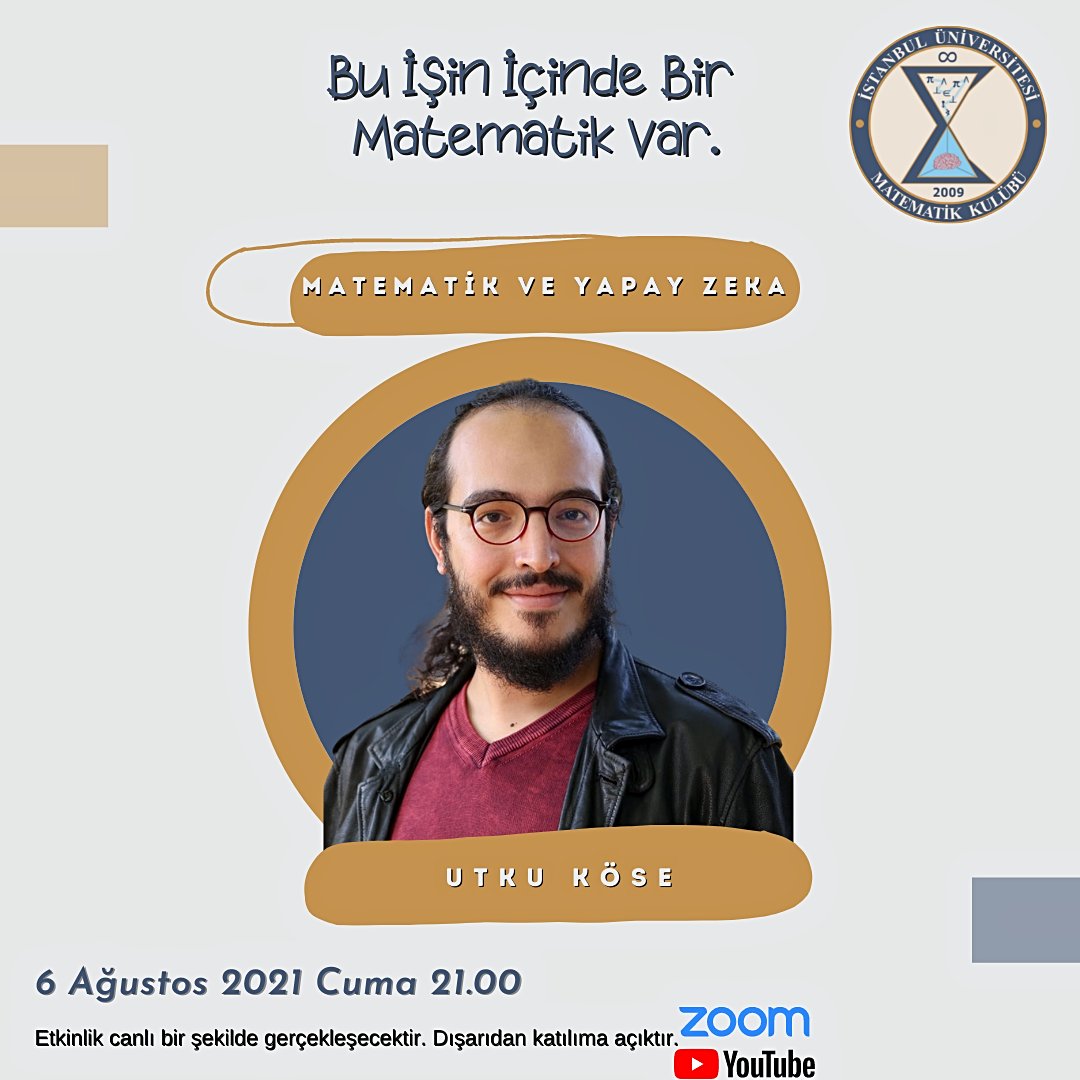 6 Ağustos Cuma saat 21.00’de Utku Köse ile matematik ve yapay zeka üzerine konuşacağız.