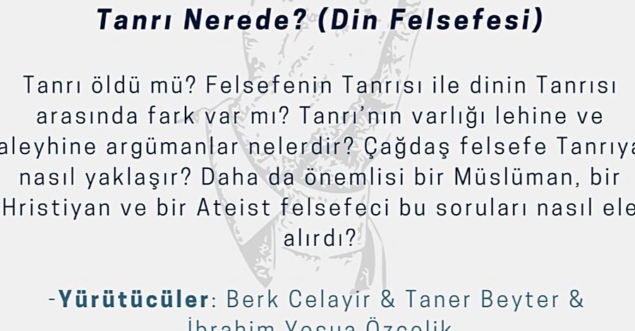 Tanrı öldü mü? Felsefenin Tanrısı ile dinin Tanrısı arasında fark var mı? Tanrı'nın varlığı lehine ve aleyhine argümanlar nelerdir? Çağdaş felsefe Tanrıya nasıl yaklaşır? Daha da önemlisi bir Müslüman bir Hristiyan ve bir Ateist felsefeci bu soruları nasıl ele alırdı?