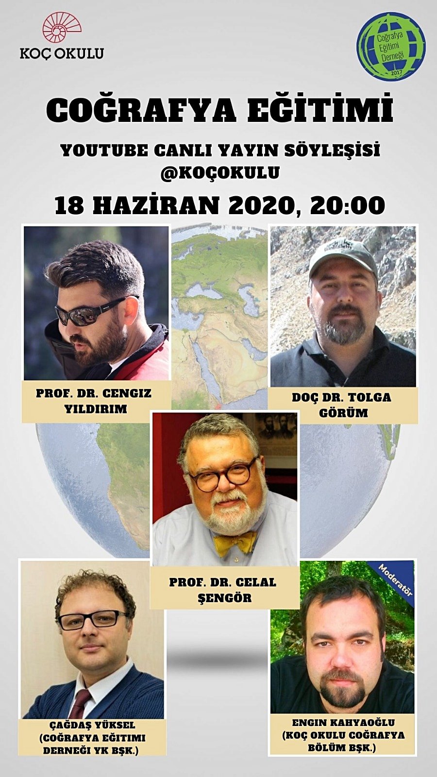 Coğrafya Eğitimi Derneği ve Koç Okulu işbirliğiyle 18 Haziran Perşembe saat 20.00'da İTÜ AYBE öğretim üyeleri Prof. Dr. Celal Şengör, Prof. Dr. Cengiz Yıldırım, Doç. Dr. Tolga Görüm Youtube canlı yayınımızda Coğrafya Eğitimi başlıklı seminerde konuğumuz olacaklar. Yayınımız Koç Okulu Youtube kanalından yayınlanacaktır.