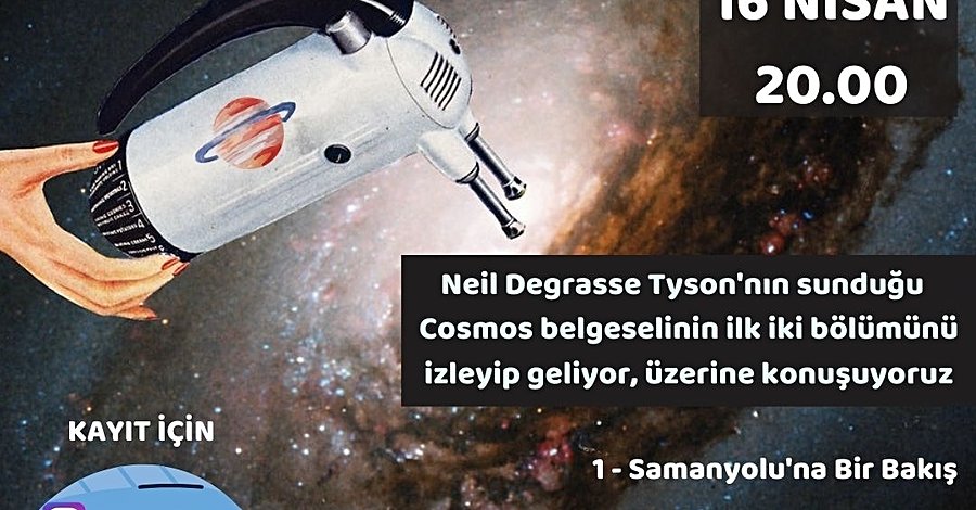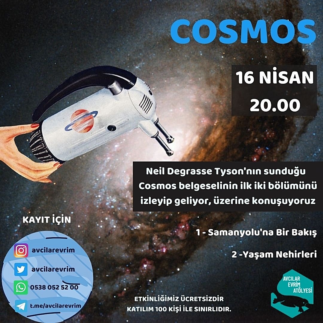 Bu etkinlik serimizde Neil deGrasse Tyson'ın sunduğu Cosmos belgeselini izleyip geliyor, üzerine tartışıyoruz.16 Nisan saat 20.00'de yapacağımız etkinliğe hepinizi bekleriz.Etkinlik katılım linki duyuru gruplarımızdan paylaşılacaktır. Katılmak için iletişime geçebilirsiniz.
