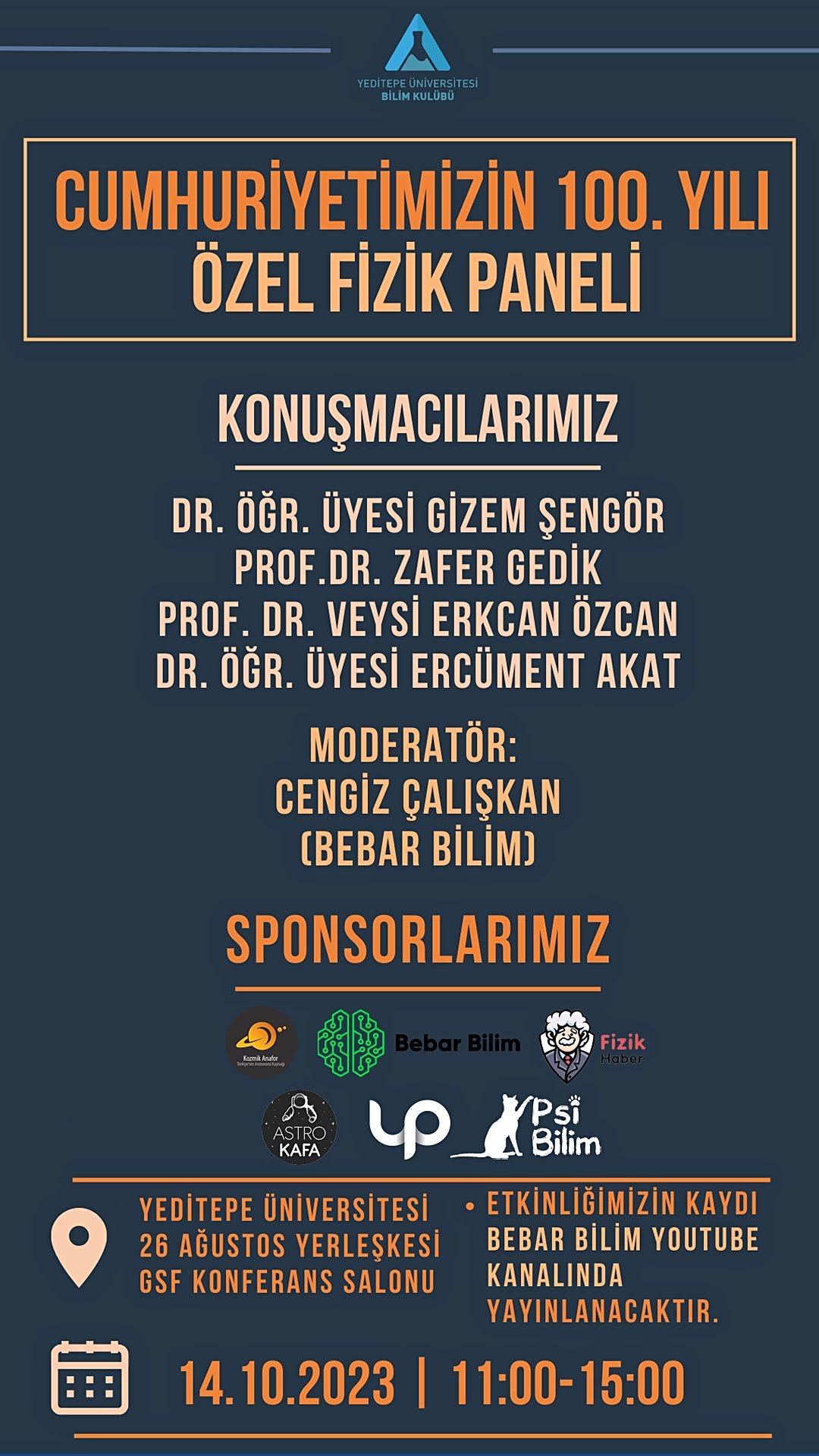 Yeditepe Üniversitesi Bilim Kulübü olarak Cumhuriyetimizin 100. yılı anlam ve önemine ithafen, değerli konuşmacılarımız ve moderatörümüzün katılımıyla düzenlediğimiz fizik panelimize hepiniz davetlisiniz!
