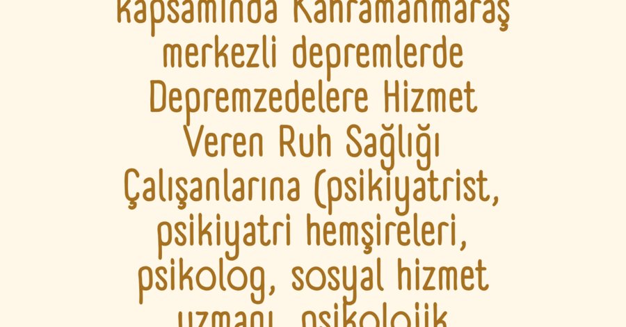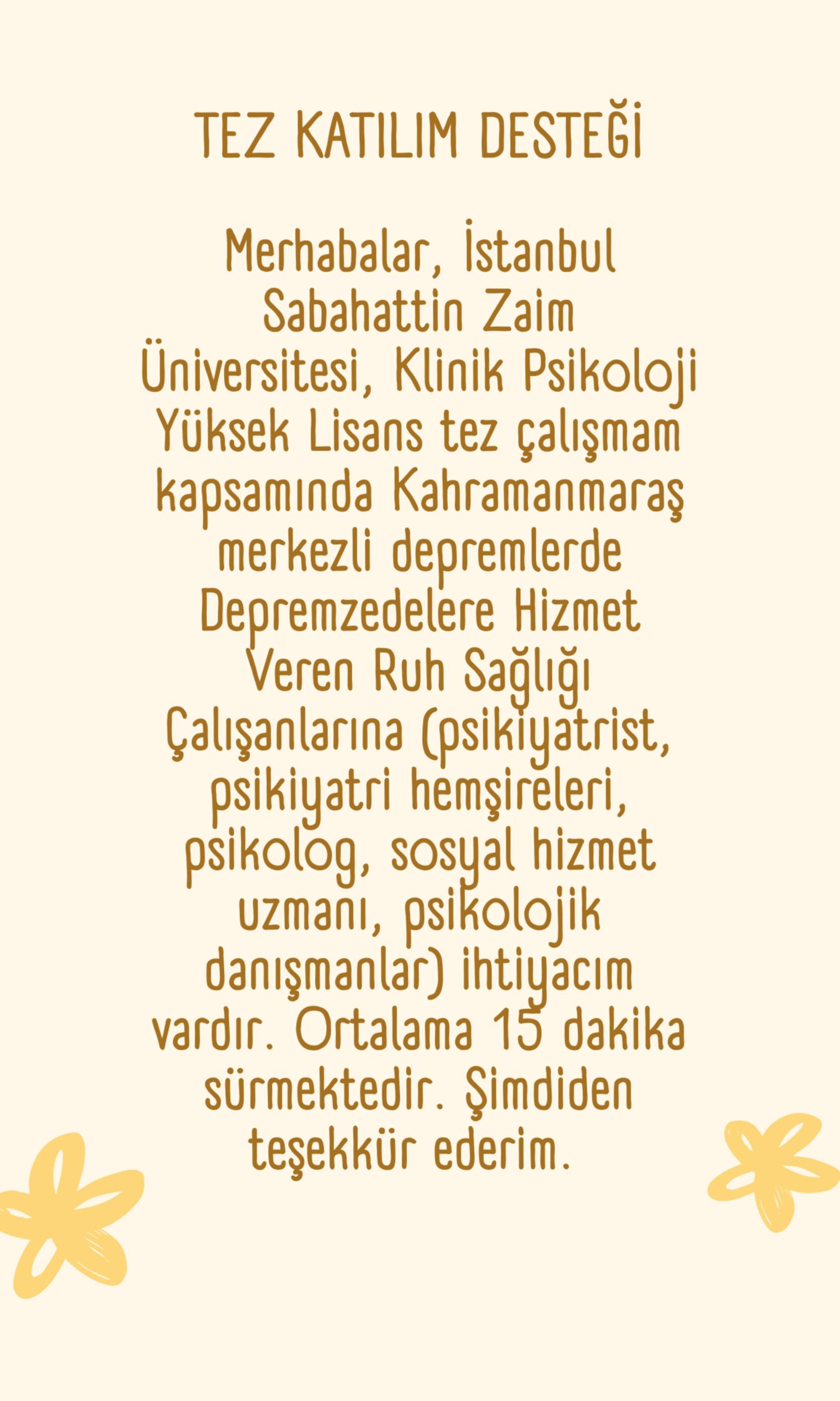 Merhabalar, İstanbul Sabahattin Zaim Üniversitesi, Klinik Psikoloji Yüksek Lisans tez çalışmam kapsamında Kahramanmaraş merkezli depremlerde Depremzedelere Hizmet Veren Ruh Sağlığı Çalışanlarına (psikiyatrist, psikiyatri hemşireleri, psikolog, sosyal hizmet uzmanı, psikolojik danışmanları ) ihtiyacım vardır. Anketi doldurarak ve katkı sağlayacağını düşündüğünüz kişilerle paylaşarak destek olursanız çok memnun olurum. Şimdiden teşekkür ederim.