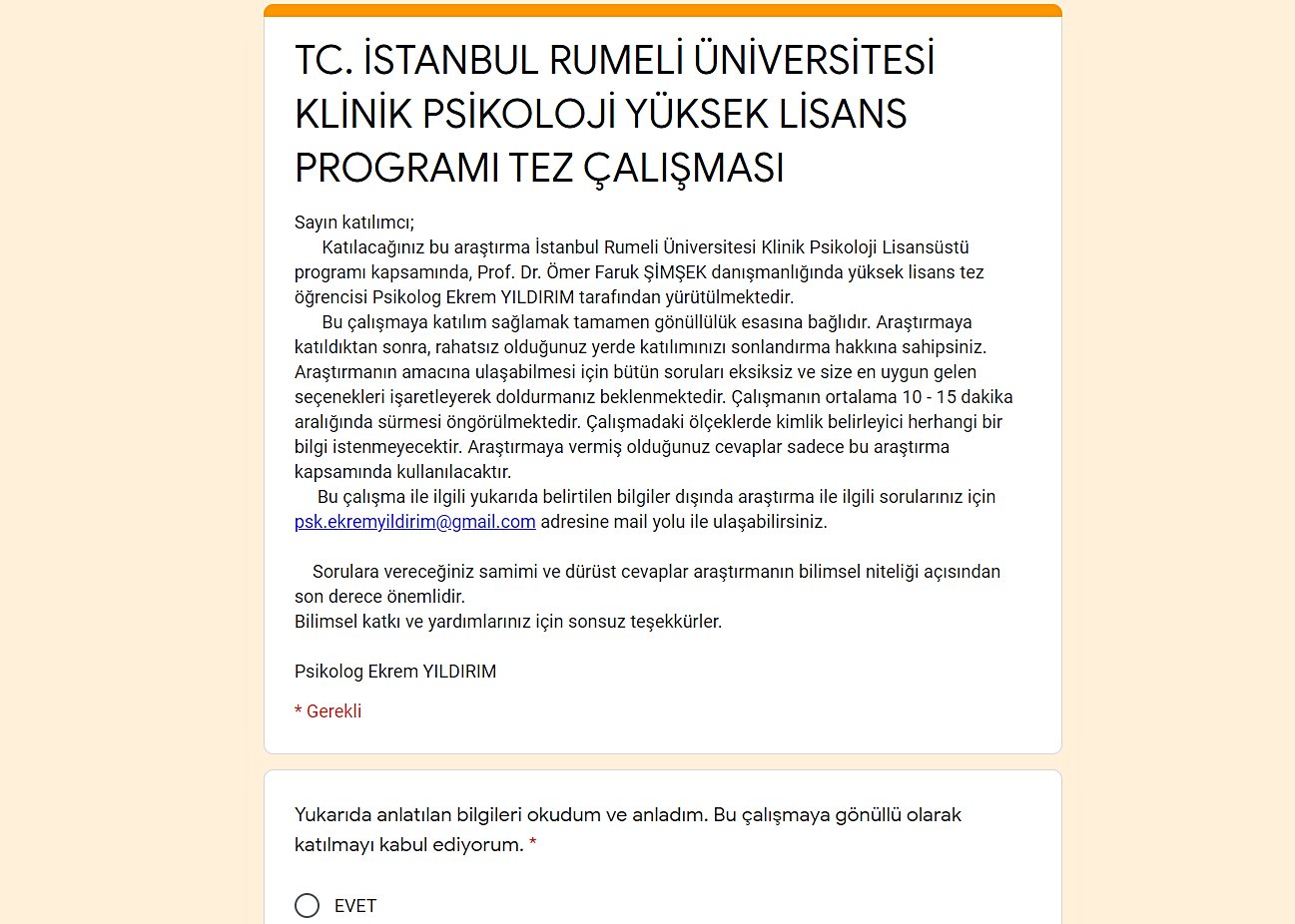 Merhabalar ben Ekrem, klinik psikoloji tezli yüksek lisans öğrencisiyim. Tez çalışmama katılımcı arıyorum. 145 maddelik bir çalışma ve 15 dk civarında tamamlanabiliyor. Şemalar, depresyon, psikolojik iyi oluş ve irrasyonel inanışlar ile ilgili ölçekler ankette karşınıza çıkacak. Çalışmama katılırsanız ve eğer mümkünse daha çok katılımcıya ulaşmama yardım ederseniz minnettar olurum.
