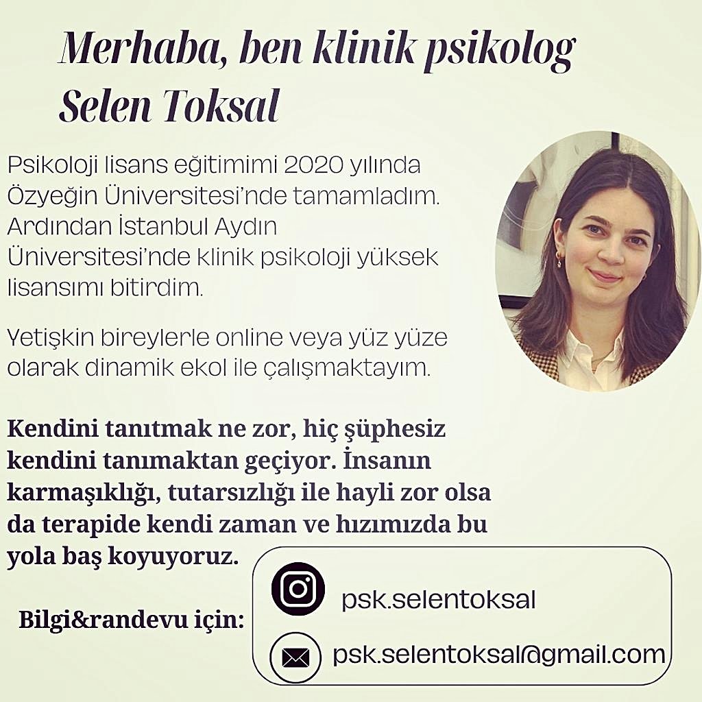 Merhaba, ben klinik psikolog Selen Toksal. Yetişkin bireylerle online veya Kadıköy'de yüz yüze olarak seansları gerçekleştiriyorum.