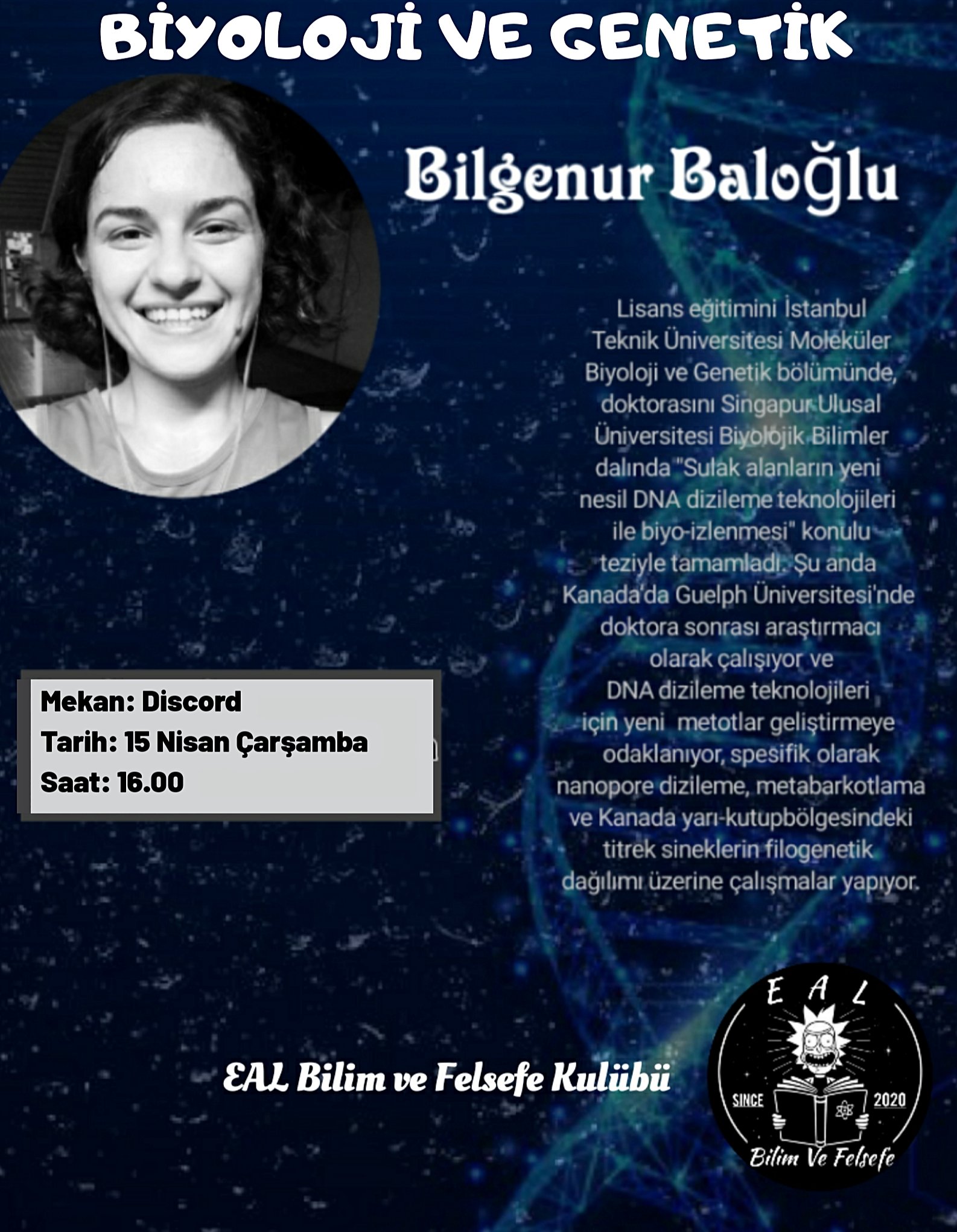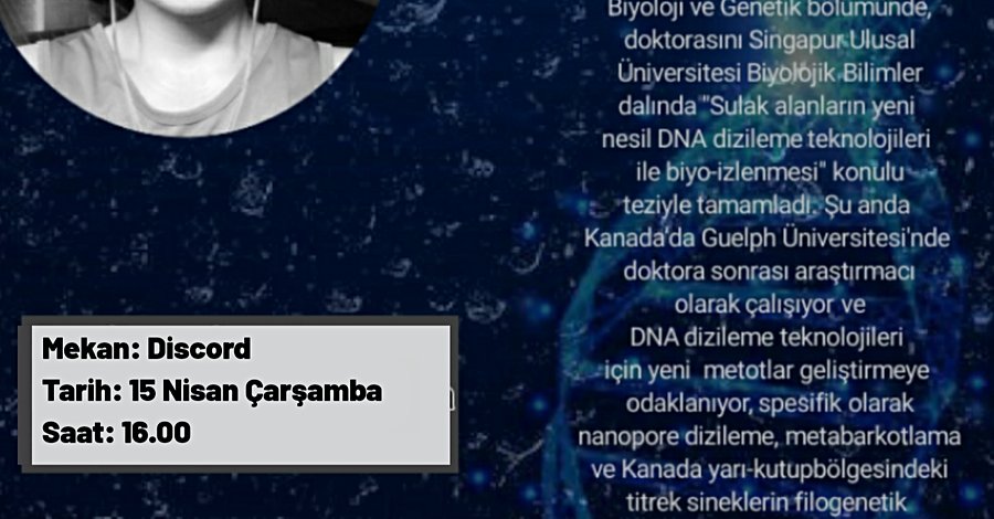 15 Nisan Çarşamba günü, 16.00'da Bilgenur Baloğlu ile discordda biyoloji ve genetik üzerine etkinlik yapıyoruz.