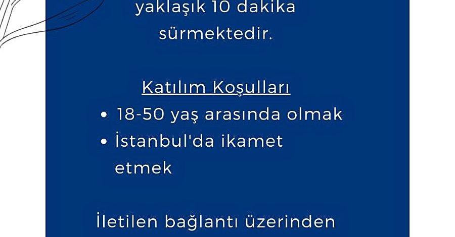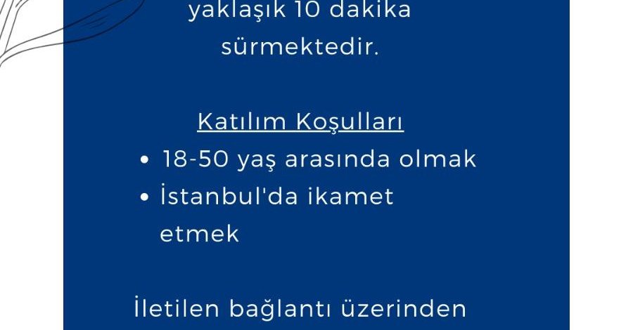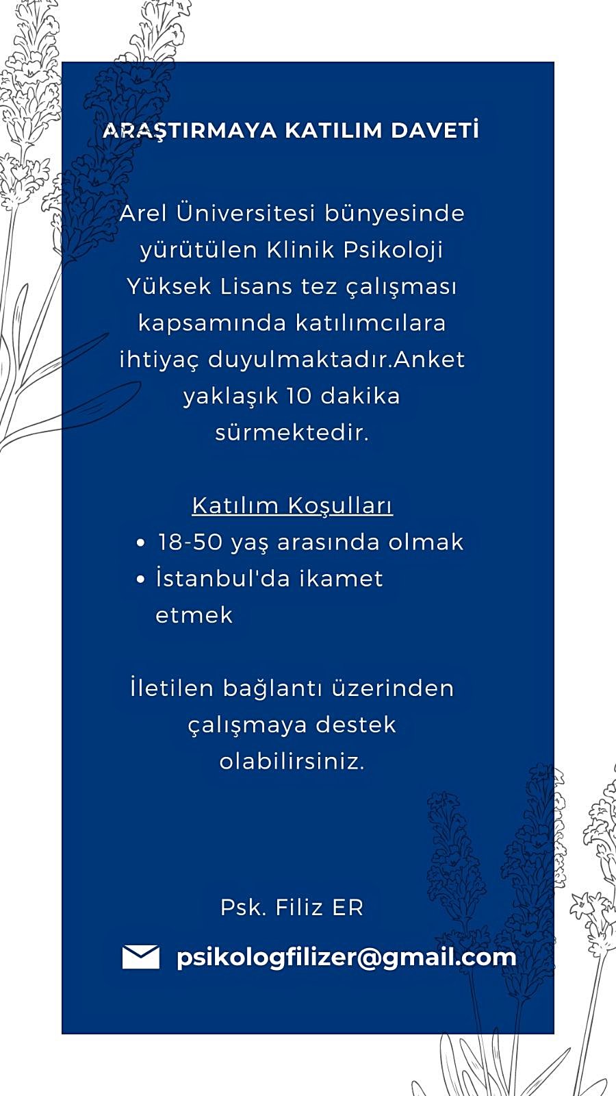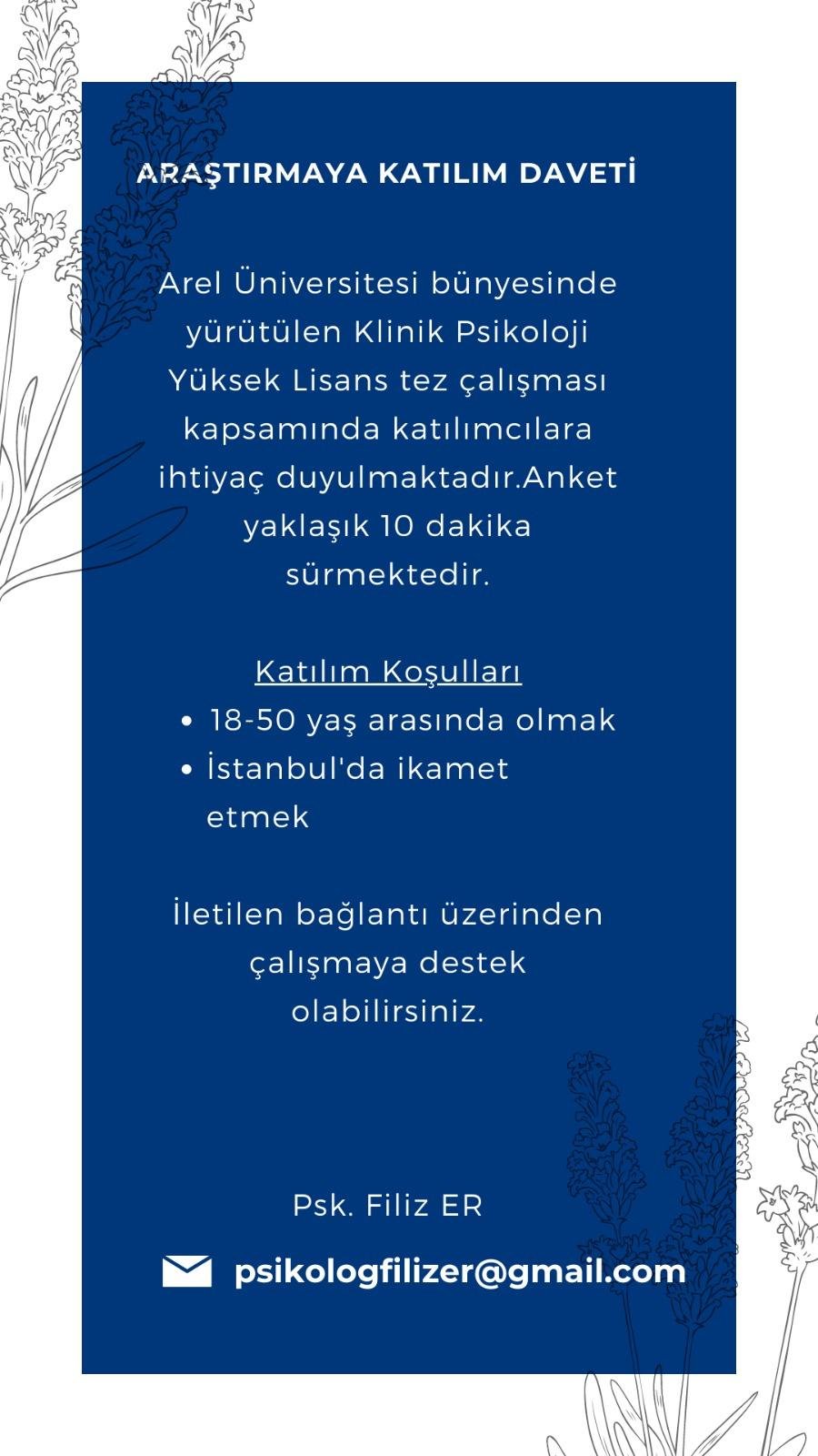 Merhaba, Klinik psikoloji yüksek lisans tez çalışmam için İstanbul'da ikamet eden, 18-50 yaş arasında olan bireylere ihtiyacım var. Anket yaklaşık 10 dk sürmektedir. Çalışmama katılıp destek olursanız sevinirim. Teşekkür ederim. Linke aşağıdan ve “Kayıt Ol” butonundan ulaşabilirsiniz.