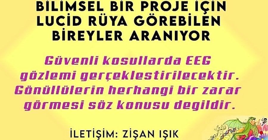 Ege Üniversitesi desteğinde Lucid rüyalar konulu bir proje yürütmekteyim. Bu kapsamda lucid rüya görebilen gönüllü bireylere ihtiyaç duymaktayım.
