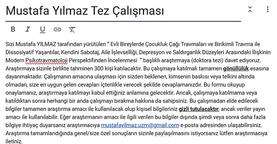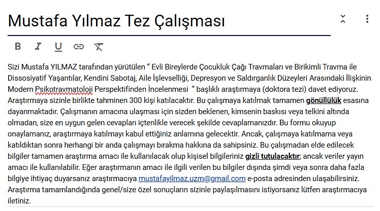 Merhaba, Doktora tez çalışmam kapsamında evli bireylerden (çift olarak) veri toplamaktayım. Çalışmanın amacı evli bireylerde çeşitli değişkenlerin birbiri ile olan ilişkisini modern psikotravmatoloji persfpektifinden incelemektir. Şimdiden katkılarınız için teşekkür ederim.