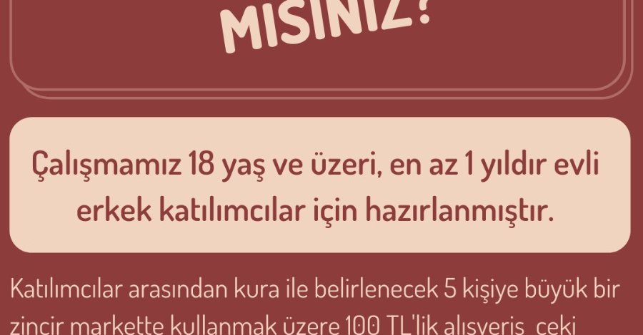 Yaklaşık 20 dakika sürecek olan araştırmamıza katılanlardan beş kişiye çekilişle büyük bir zincir markette kullanılmak üzere 100 TL değerinde alışveriş çeki verilecektir.