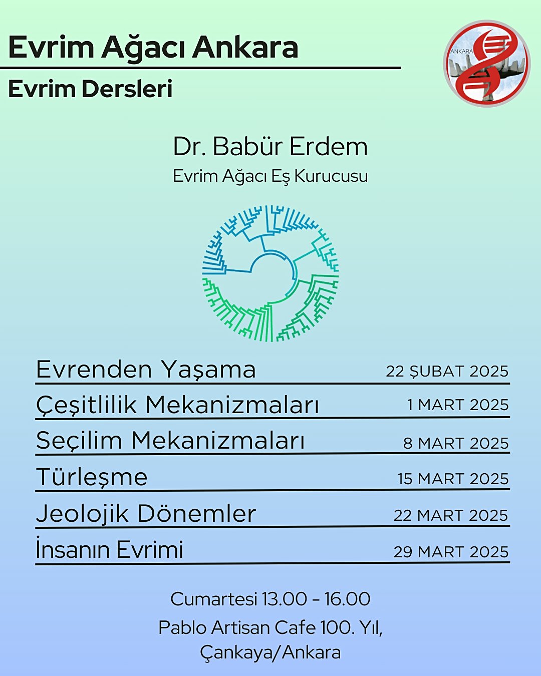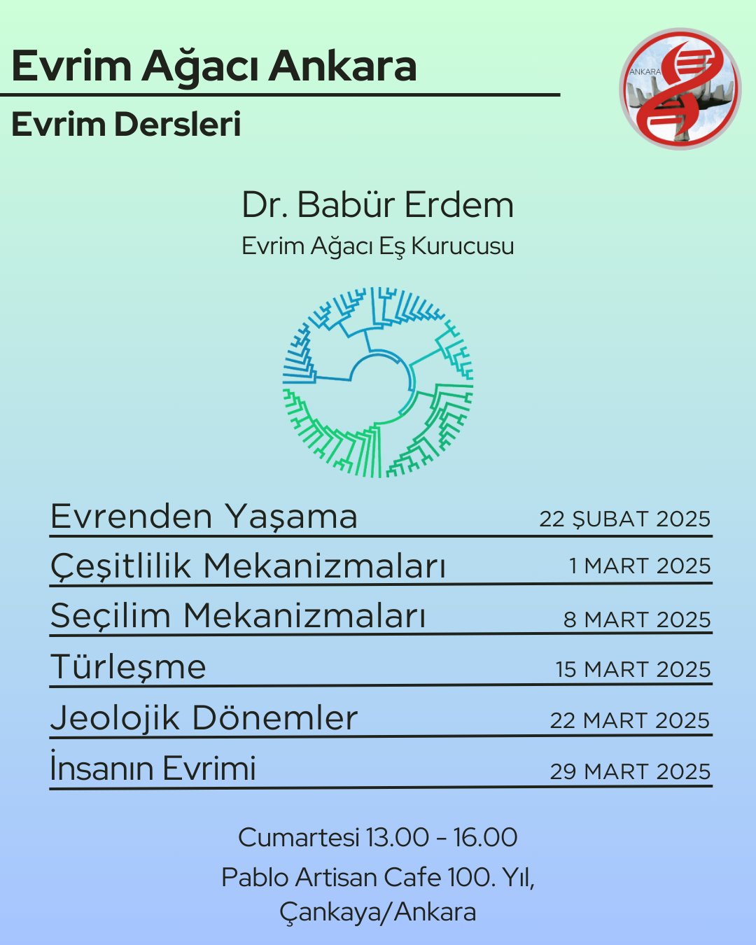 Dersler Evrim Ağacı eş kurucusu Dr. Babür Erdem tarafından verilecektir ve 6 ayrı günde 6 ayrı dersi içermektedir. Türleşme, seçilim, jeolojik dönemler ve İnsanın Evrimi gibi Evrim Teorisinin temel konularını öğrenebileceğiniz ve bilimseverler ile tanışabileceğiniz etkinliğimize bekliyoruz.