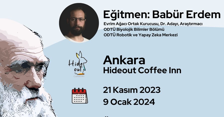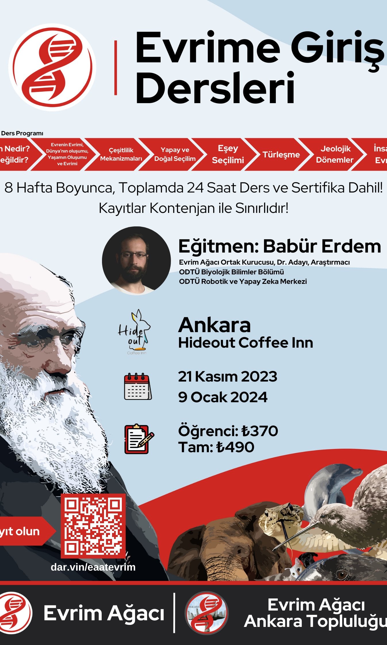 Evrim Ağacı Evrime Giriş Dersleri, 21 Kasım 2023 tarihinde ilk dersi ile başlayacaktır. Toplamda 8 ders yapılacaktır ve 8 hafta sürecektir. Her ders 3 saat sürecektir. Dersler; ODTÜ Biyolojik Bilimler Bölümü ve ODTÜ Robotik ve Yapay Zeka Merkezi'nden Evrim Ağacı'nın ortak kurucusu Babür Erdem tarafından verilecektir.