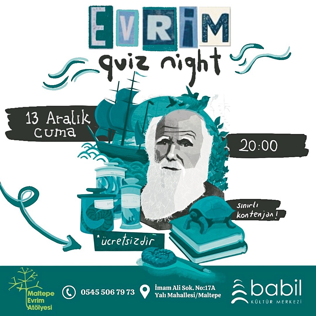 ❓Maltepe Evrim Atölyesi ile ortak düzenlenecek etkinlikte evrim, evrimsel biyoloji, bilim tarihi üzerine 40 klasik soru sorulacak, en çok doğru cevapla tamamlayan kişi ya da grup sürpriz hediyenin sahibi olacak.
