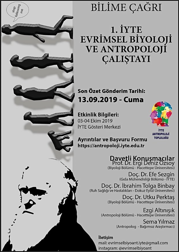 İzmir Yüksek Teknoloji Enstitüsü Antropoloji Topluluğu olarak uzun uğraş ve emeklerle hazırladığımız bu çalıştay 3-4 Ekim’de İYTE Gösteri Merkezi’nde gerçekleşecektir. 1. EBAÇ olarak adlandırdığımız ve gelenekselleşmesini umut ettiğimiz etkinliğimiz iki gün boyunca her iki alanda birbirinden değerli hocalar tarafından farklı açılar ile değerlendirilecektir.