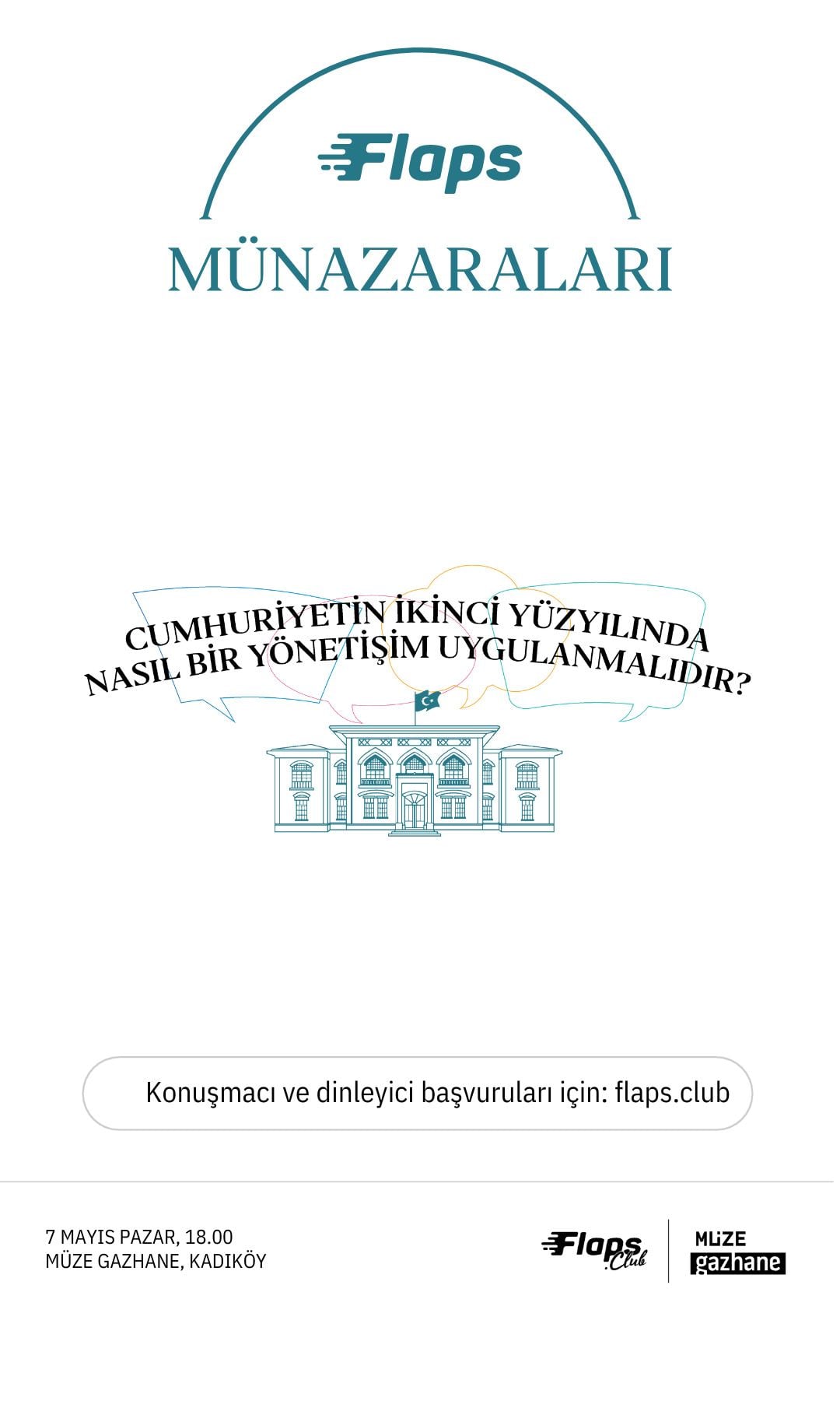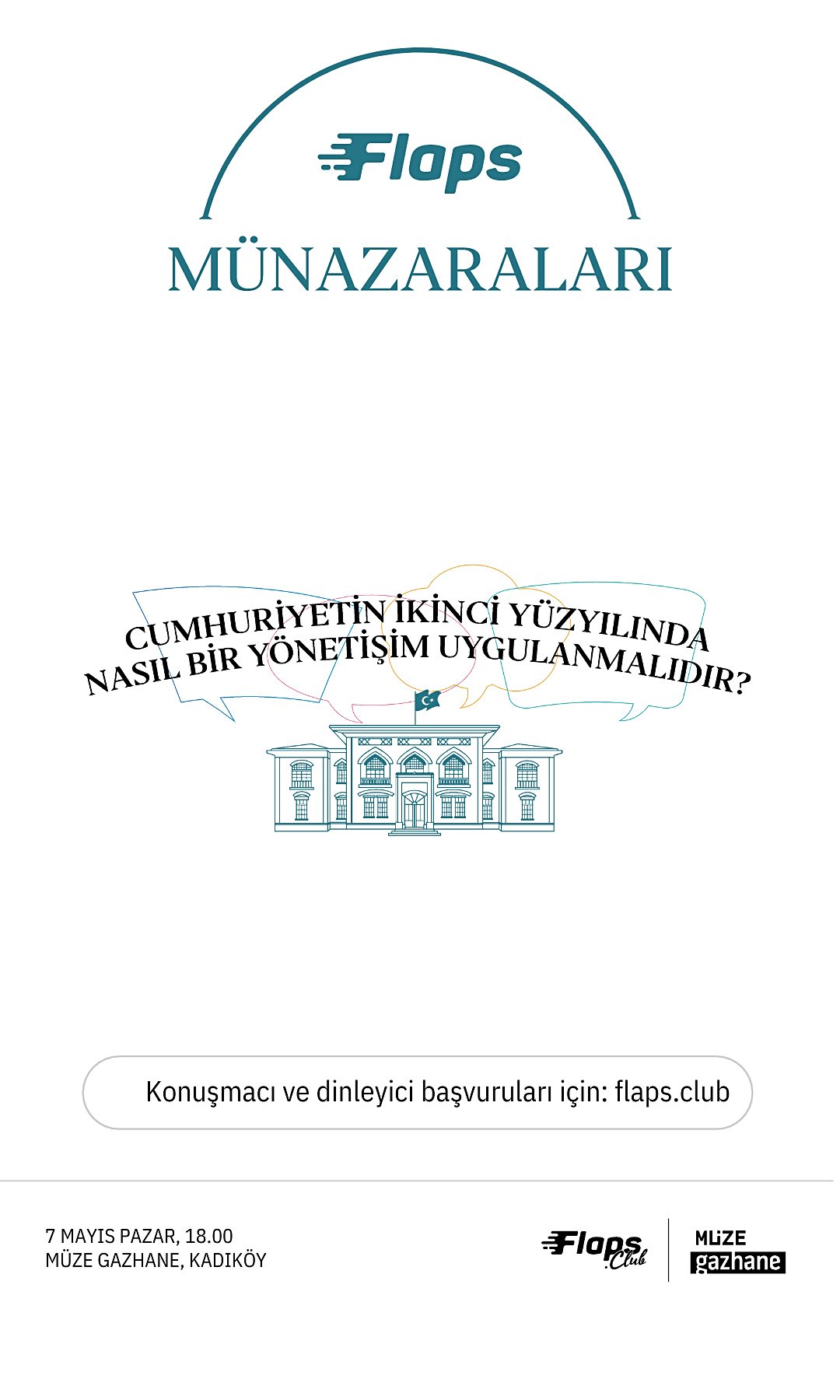 Flaps Club olarak, 2023 seçimlerinin hemen öncesinde kamu yönetimi ve siyaset biliminin temel gündemini Flaps Münazaraları'nda masaya yatırıyoruz. 7 Mayıs Pazar akşamı saat 18'de başlayacak etkinliğimizde, Müze Gazhane T Atölye'de “Cumhuriyetin ikinci yüzyılında nasıl bir yönetişim uygulanmalıdır?” sorusunu ele alacağız.