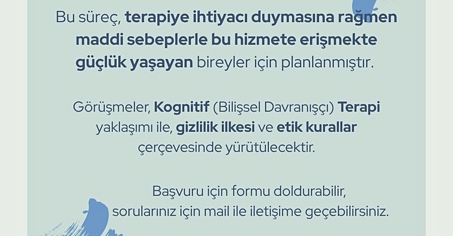 Bu süreç, terapiye ihtiyaç duymasına rağmen maddi sebeplerle bu hizmete erişmekte güçlük yaşayan bireyler için planlanmıştır. Görüşmeler, Kognitif (Bilişsel Davranışçı) Terapi yaklaşımı ile, gizlilik ilkesi ve etik kurallar çerçevesinde yürütülecektir.