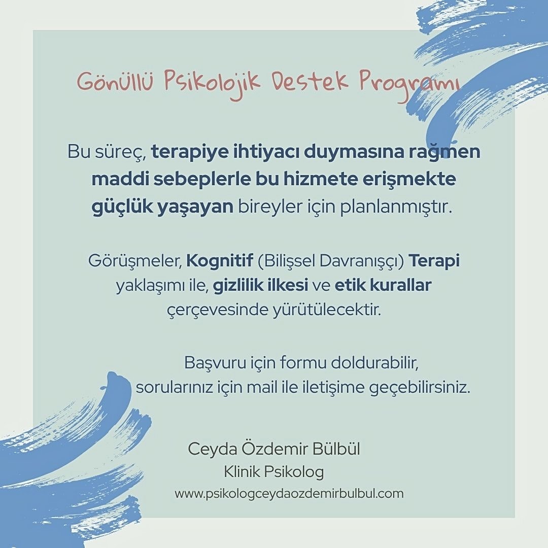 Gönüllü Psikolojik Destek Programı kapsamında, alabileceğim danışan sayısı sınırlıdır ve bu nedenle sınırlı sayıda başvuru kabul edilecektir.