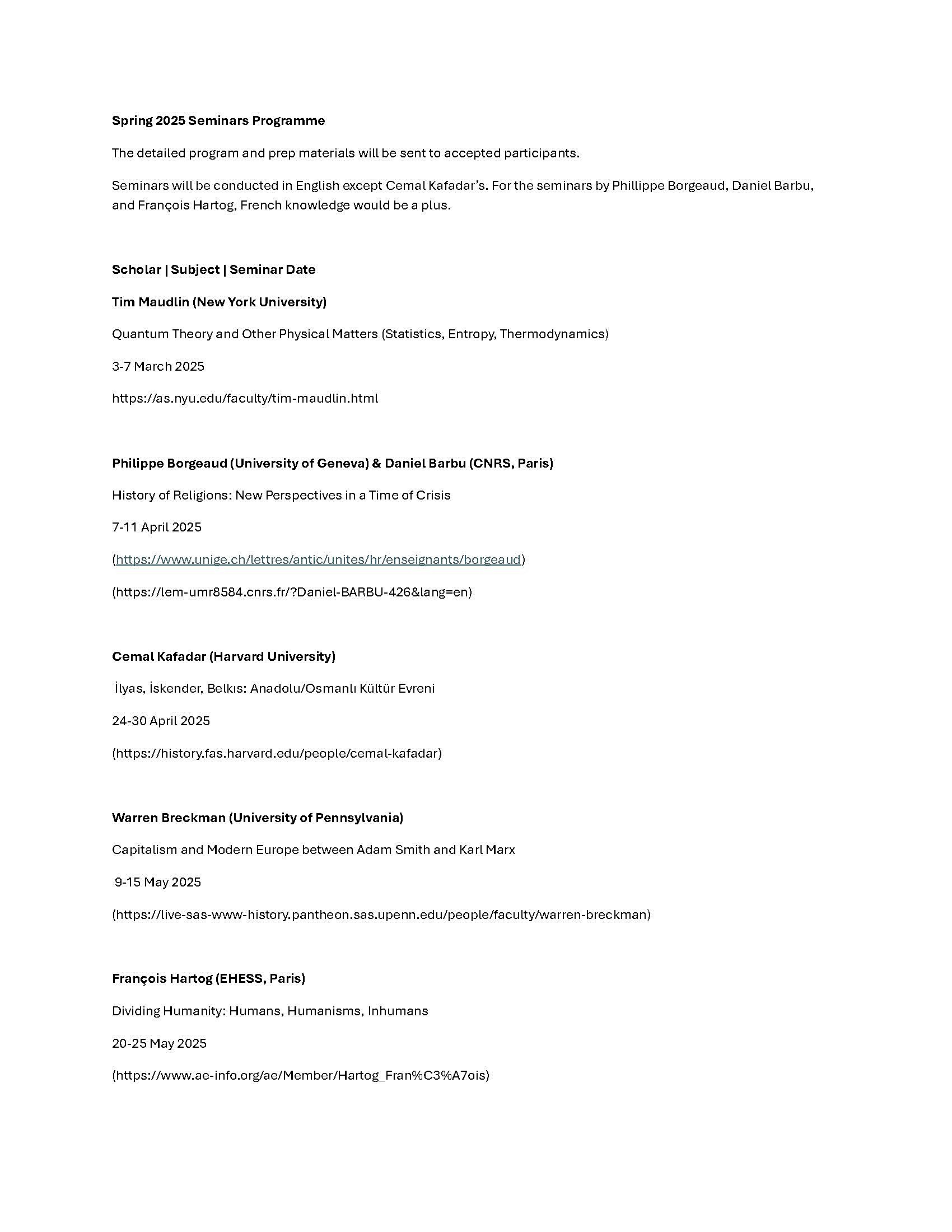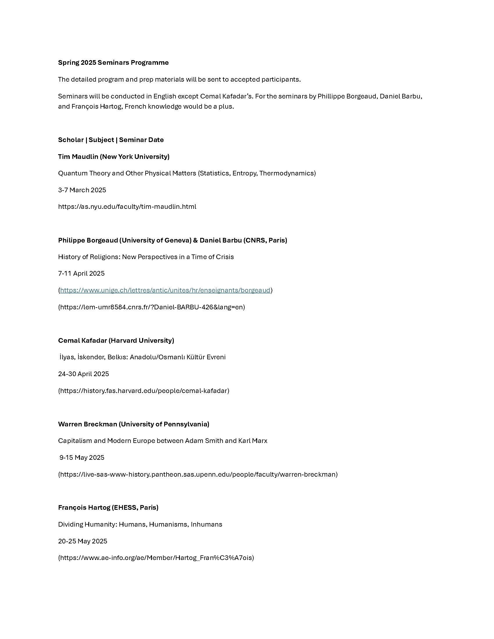Fizik, felsefe, tarih ve ekonomi gibi alanlarda gerçekleşecek ileri düzey seminerlerde, her biri kendi disiplininde çığır açan çalışmalar yapmış akademisyenler ders verecek: