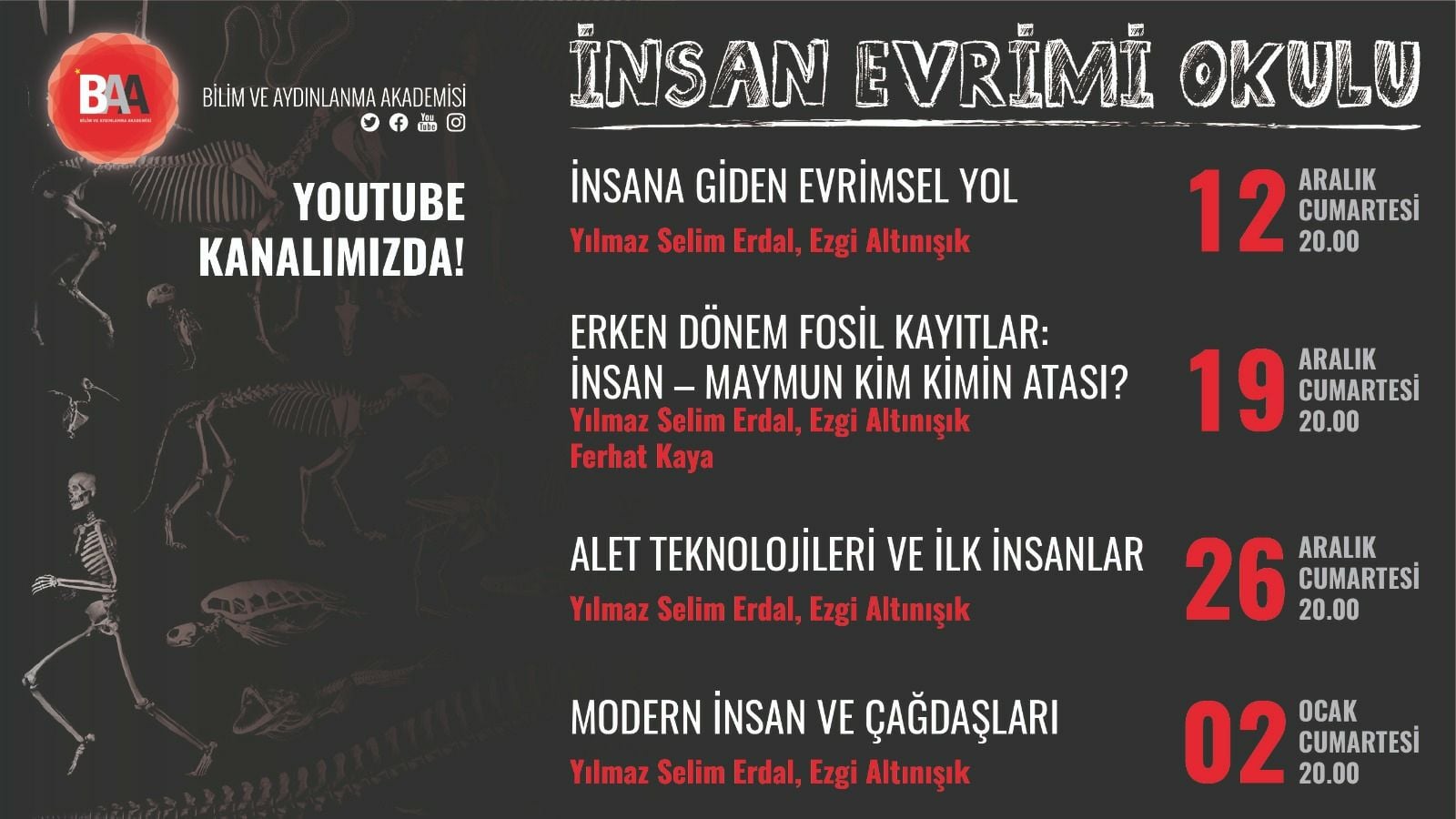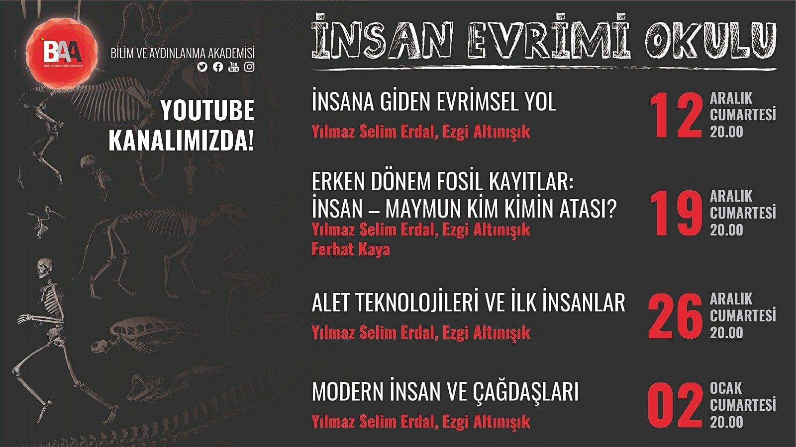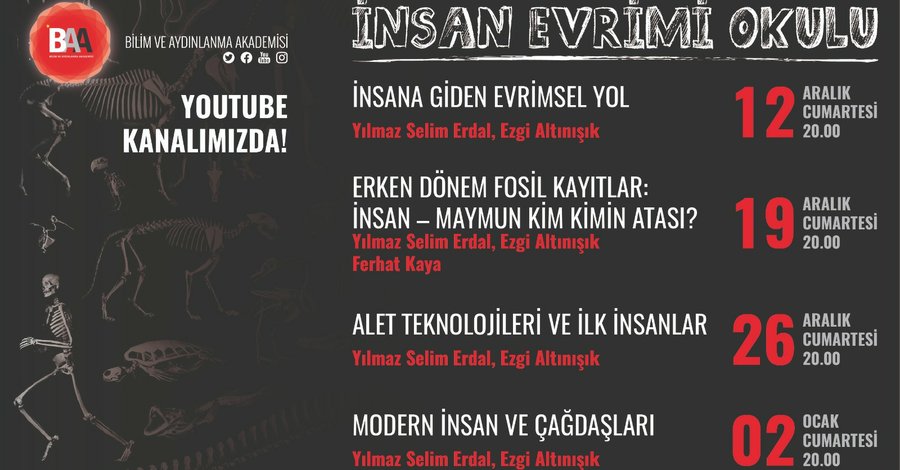 Bilim ve Aydınlanma Akademisi tarafından çevrim içi olarak düzenlenen İnsan Evrimi Okulu, 4 hafta boyunca Youtube üzerinden canlı yayınlanacak. İlk hafta konu insanın evrim ağacındaki yeri.