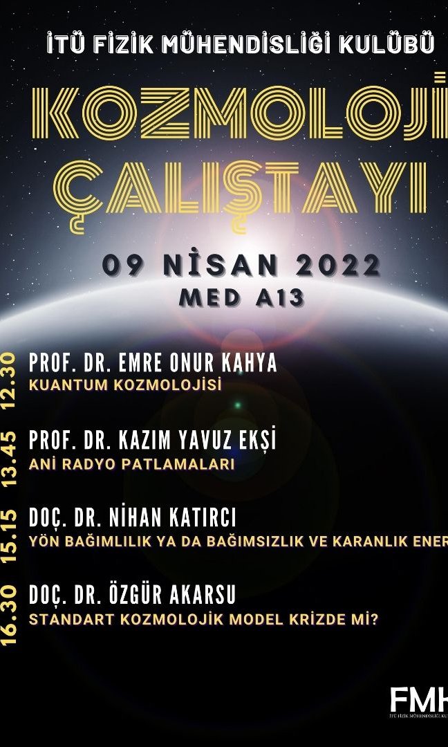 İTÜ Fizik Mühendisliği Kulübü tarafından 9 Nisan 2022 Cumartesi günü İTÜ Ayazağa Kampüsü Merkezi Derslik binası A-13 amfisinde gerçekleştirilecek olan programda, alalarında uzman hocalarımızın katkısıyla bir Kozmoloji Çalıştayı sağlancak. Tüm fizikseverlere açık olan çalıştayımızda, katılımın kontrolünün ve katılım belgelerinin sağlıklı dağıtımı için bir form doldurulması zorunluluğu vardır.