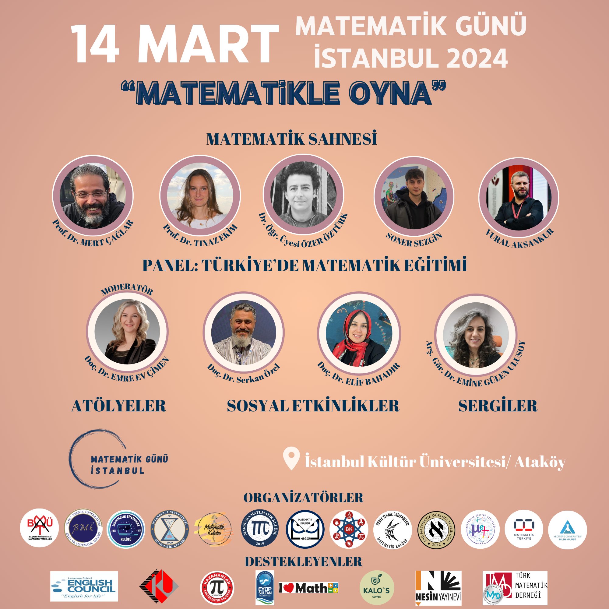 Dünya Matematik Günü için on üç matematik topluluğu birleşerek bu günü kutlamak için ortak bir etkinlik düzenliyoruz. Konuşmaların, panellerin, matematik atölyelerinin, sergilerin ve daha birçok etkinliğin yer alacağı Matematik Günü İstanbul'da matematikle ilgilenen herkesi davet ediyor ve bir araya getirmek istiyoruz. 14 Mart 2024'de İstanbul Kültür Üniversitesi Ataköy Kampüsünde gerçekleşecek etkinliğe tüm matematik severler davetli! Detayları sosyal medya hesaplarından ve web sitesinden duyurmaya devam ediyoruz. Etkinlikte görüşmek dileğiyle.
