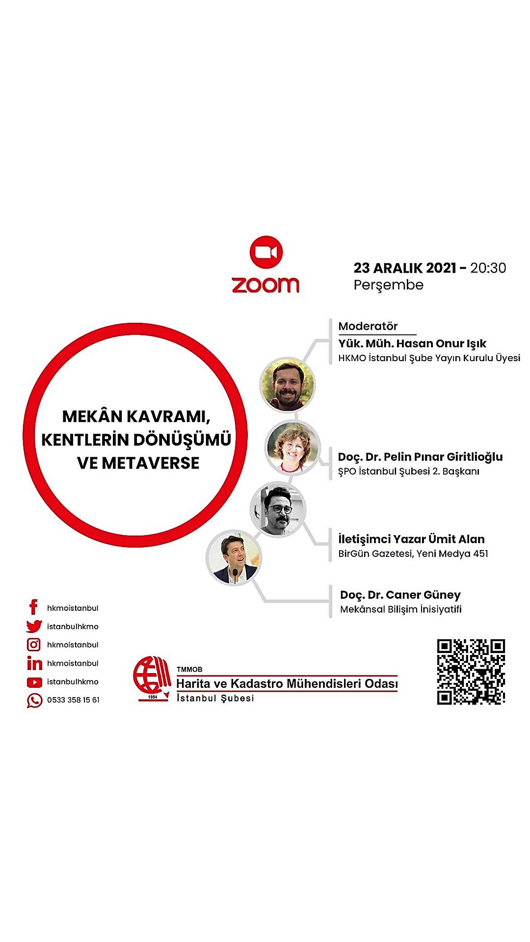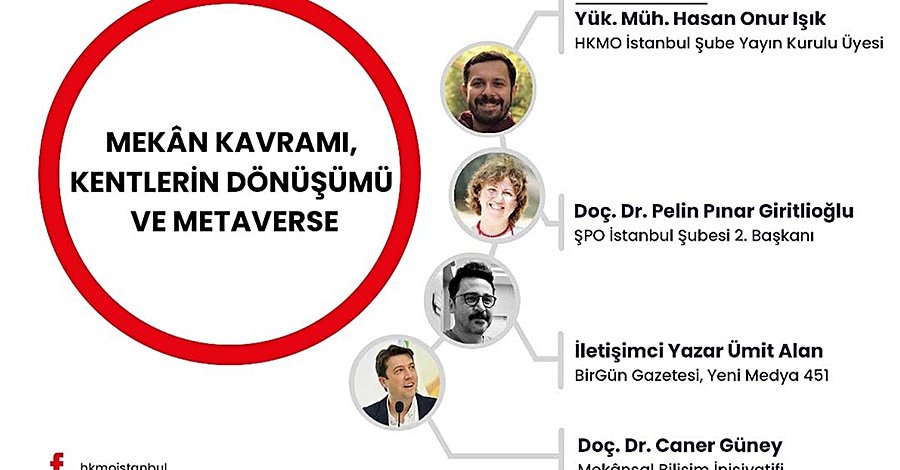 Bu kapsamda, Şubemiz tarafından, kent ve kentli ilişkilerini, toplumsal faaliyet ve üretim ilişkilerini, mekânın temsili olan dijital haritacılık uygulamaları ile mekân dönüşümünün geleceğini Haritacılık, Planlama ve Sosyal İletişim ekseninde tartışacağımız "Mekân Kavramı, Kentlerin Dönüşümü ve Metaverse" konulu bir etkinlik düzenlenecektir.