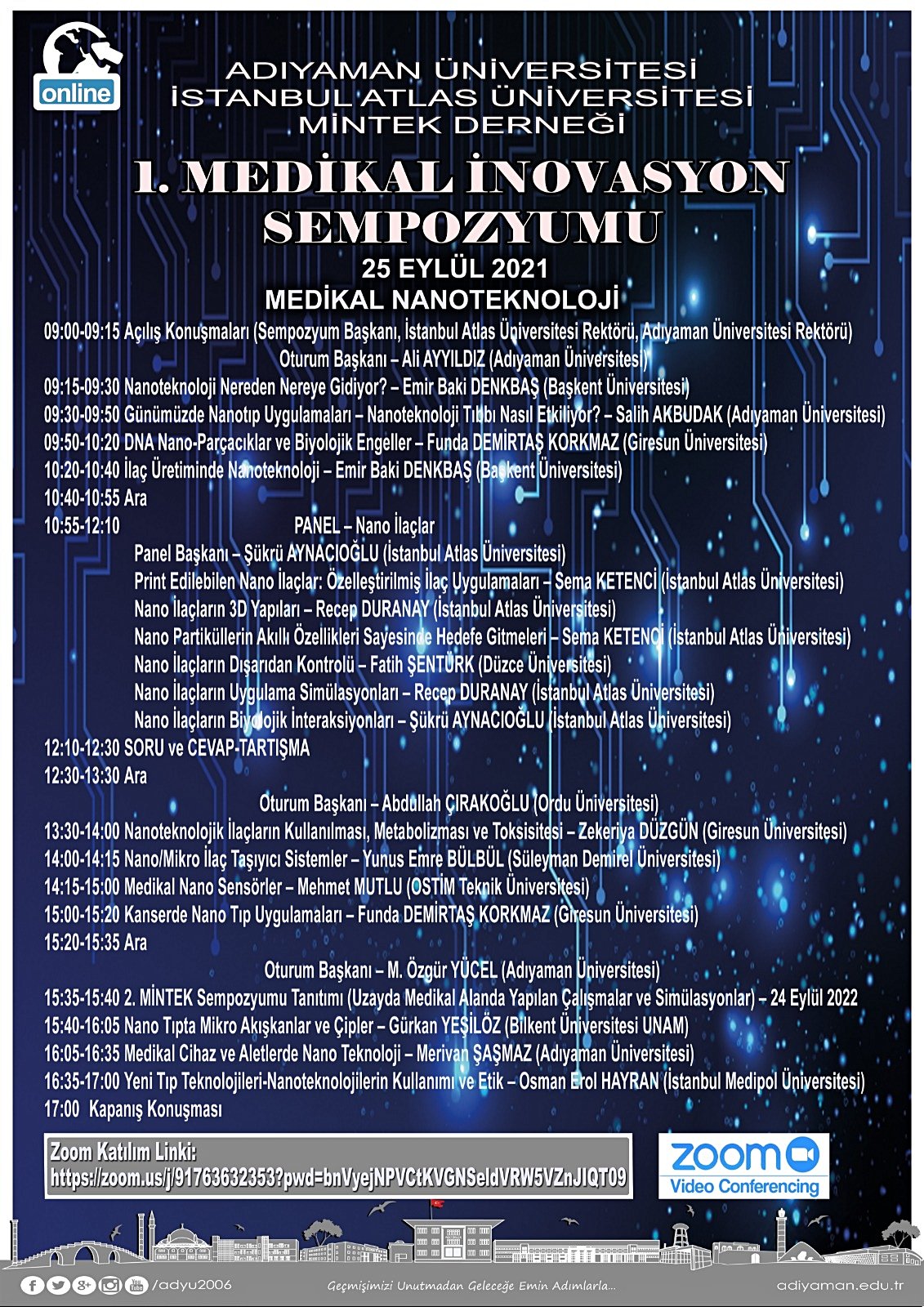 Medikal İnovasyon, Teknoloji ve Kuantum (MİNTEK) Derneği olarak 1. Medikal İnovasyon Sempozyumunu bilim insanları ve öğrencilerle paylaşmak istiyoruz. Bu sempozyumun konusu "Medikal Nanoteknoloji"dir. Zoom linki aşağıda verilmiştir. Davet ediyoruz....