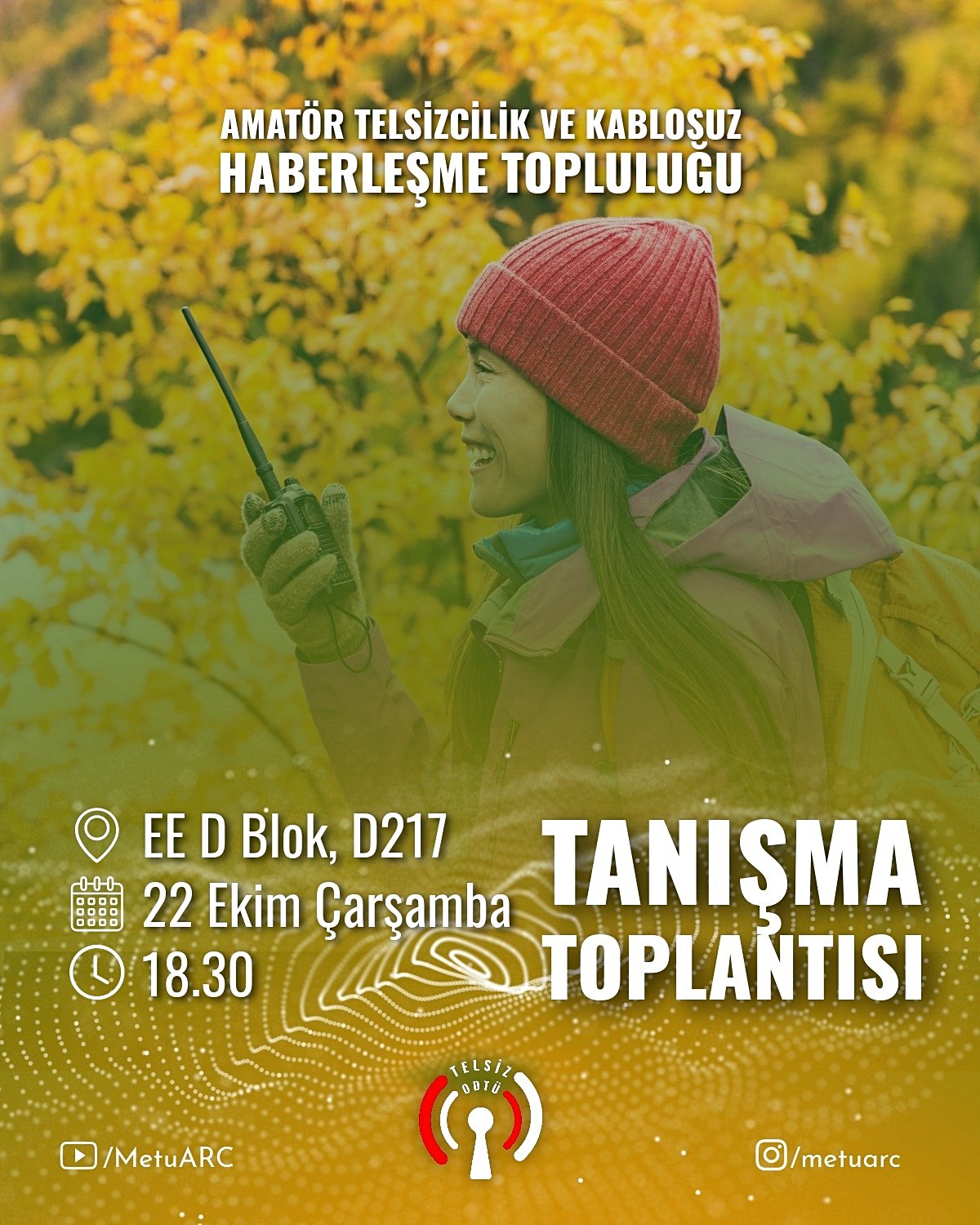 bu dönemdeki tanışma toplantımızı sizlere duyurmaktan kıvanç duyuyoruz. Kablosuz haberleşmeye, telsiz teknolojilerine ve iletişimin teknik dünyasına ilgi duyuyorsanız, sizi ODTÜ Amatör Telsizcilik ve Kablosuz Haberleşme Topluluğu’nun tanışma toplantısına bekliyoruz.