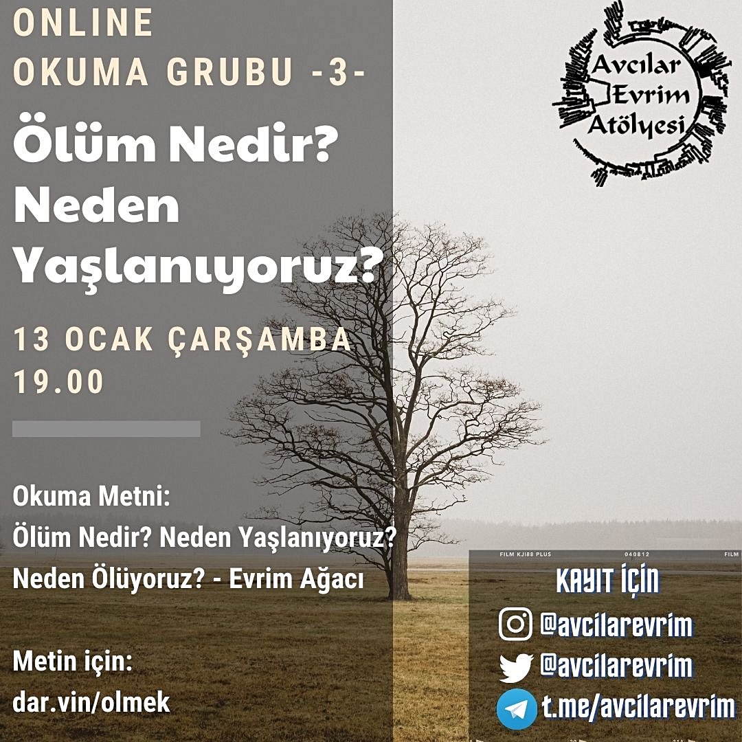Online okuma grubumuzun 3. buluşmasında bu akşam 7'de "Ölüm Nedir? Neden Yaşlanıyoruz?" soruları üzerine konuşacağız. Okuma metnimiz Evrim Ağacı sitesinden: