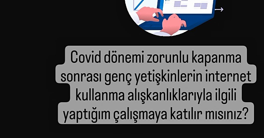 Merhaba, ben istinye Üniversitesinde tezli yüksek lisans yapmaktayım. COVID döneminde zorunlu kapanma sonrası genç yetişkinlerin internet kullanma, yalnızlık ve özkontrolüne dair bir çalışma yürütmekteyim.Tezim için katılımcıya ihtiyacım var. (Spss'te moderator mediator etkilere bakamadım veri sayim az geldi.) Bu formda isim e-posta gibi bilgiler istenmiyor. Katılım sağlayabilir misiniz? Genç yetişkin grubu olarak 18 -25 yaş grubuyla çalışıyorum. Katılımınızı bekliyorum. Şimdiden teşekkür ederim.