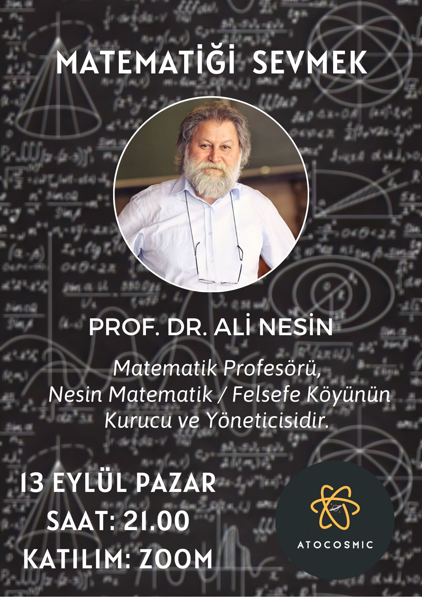 Herkese merhaba. Çok sevdiğimiz bir hocamız olan Prof. Dr. Hüseyin Ali Nesin ile 13 Eylül Pazar saat 21.00 da Zoom üzerinden "Matematiği Sevmek" konulu bir söyleşi yapıyoruz.