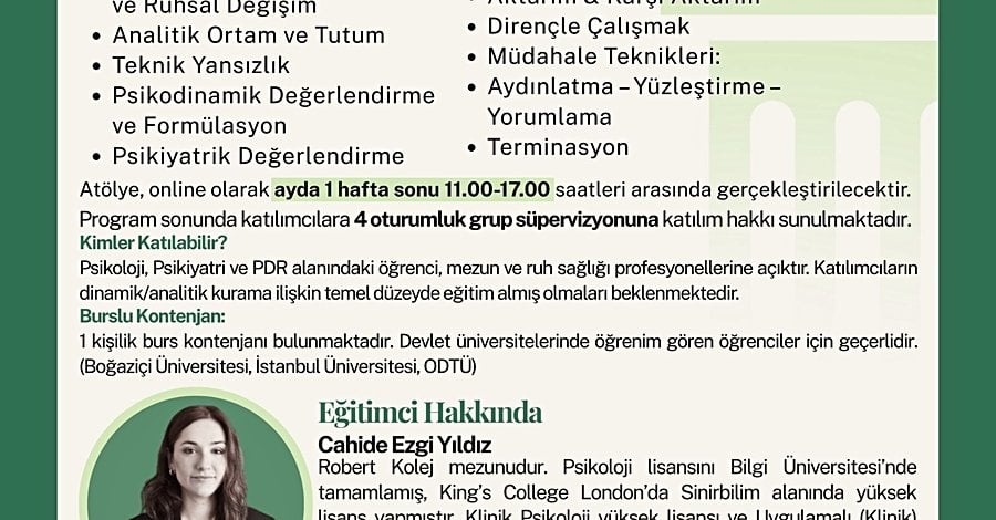 Psikodinamik terapinin kuramsal ve klinik temellerini derinlemesine ele alan bu program, katılımcıların terapötik süreci anlayabilen, klinik olarak düşünebilen ve müdahalelerini kuramsal bir zemine oturtabilen bir perspektif geliştirmelerini hedeflemektedir.