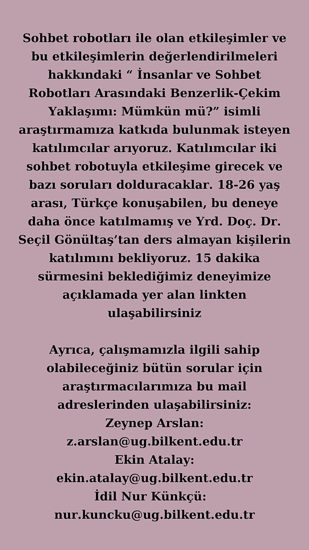 Sohbet robotları ile olan etkileşimler ve bu etkileşimlerin değerlendirilmeleri hakkındaki “ İnsanlar ve Sohbet Robotları Arasındaki Benzerlik-Çekim Yaklaşımı: Mümkün mü?” isimli araştırmamıza katkıda bulunmak isteyen katılımcılar arıyoruz. Katılımcılar iki sohbet robotuyla etkileşime girecek ve bazı soruları dolduracaklar. 18-26 yaş arası, Türkçe konuşabilen, bu deneye daha önce katılmamış ve Yrd. Doç. Dr. Seçil Gönültaş’tan ders almayan kişilerin katılımını bekliyoruz. 15 dakika sürmesini beklediğimiz deneyimize bu linkten ulaşabilirsiniz: