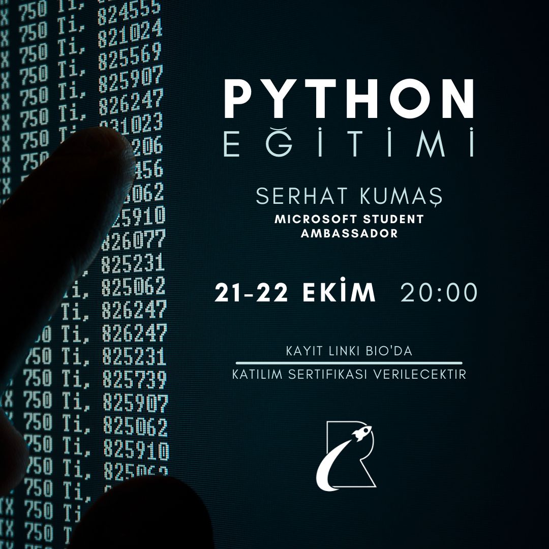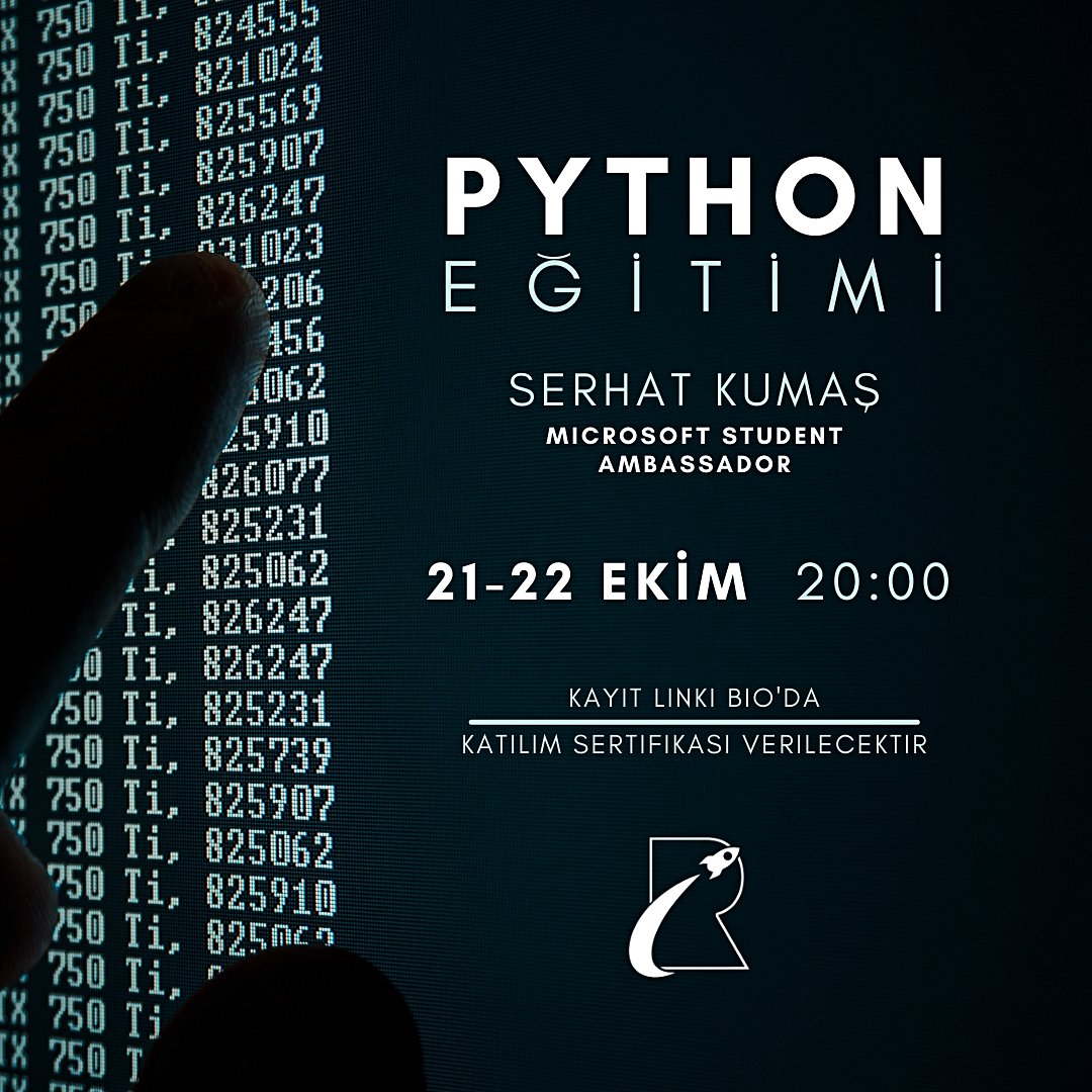 21 ve 22 Ekim tarihlerinde saat 20:00’da başlayacak olan 2 oturumluk eğitimimizi Microsoft Student Ambassador Serhat Kumaş verecek. Sıfırdan başlayacağımız eğitimimize Python öğrenmek isteyen herkes davetlidir.
