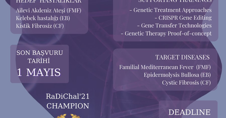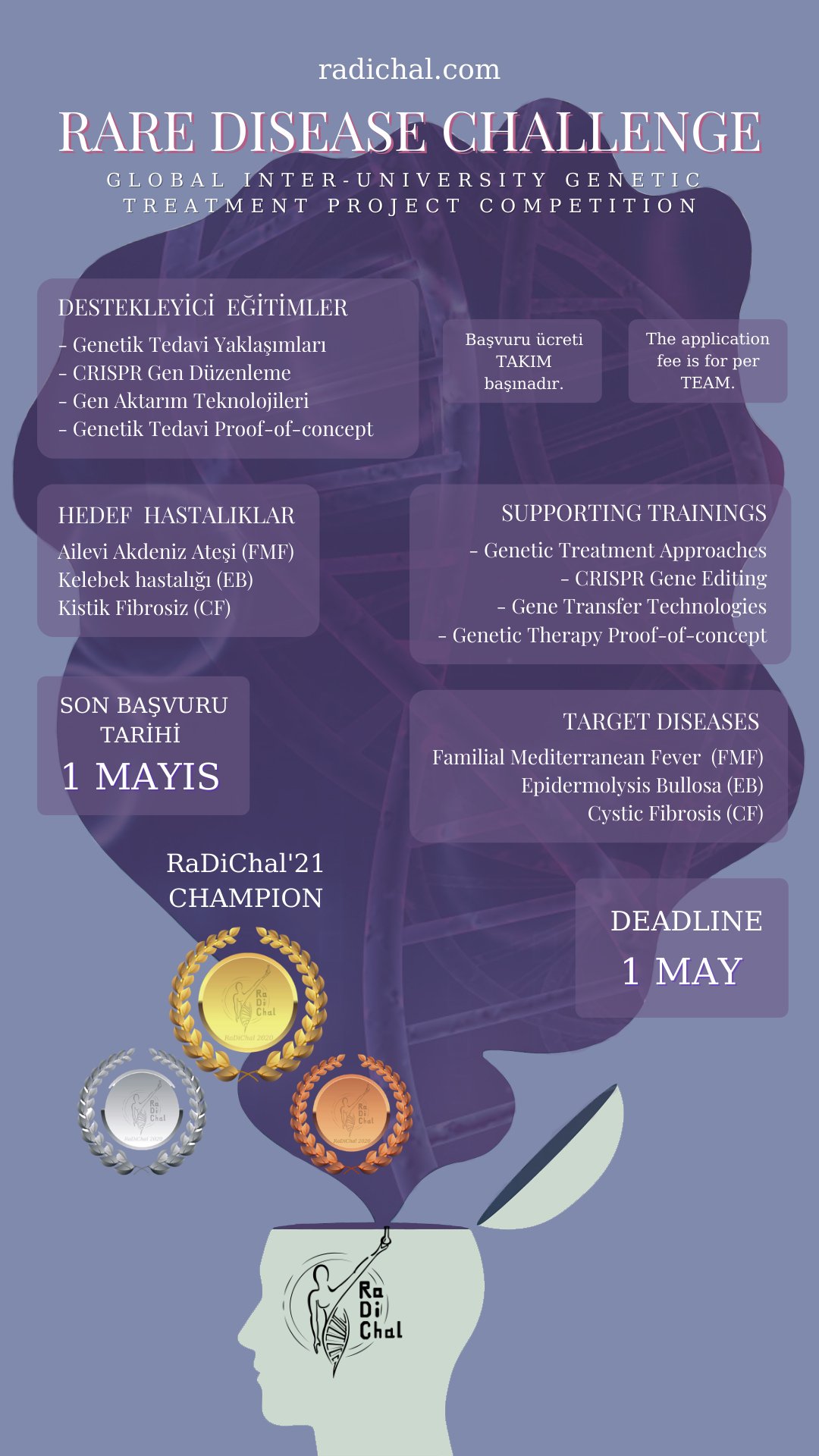 Genetik sorunlar sonucu oluşan hastalıkların birçoğunun tedavisi günümüzde bulunmamaktadır. Olan tedaviler ise oldukça pahalıdır. Bunun gibi sorunlar görüldüğünde nadir hastalık sahibi olan bireylere bir çıkış yolu aramak ve en nihayetinde bir tedavi bulabilmek için farklı çalışmalara öncülük edebilmek amacı ile Sevgili Dr. Cihan Taştan ile birlikte RaDiChal (Rare Disease Challenge) adında Global Üniversiteler Arası birçok farklı bölümden öğrencilerin katıldığı, bağımsız Nadir Hastalıklar Genetik Tedavi Proje Yarışması düzenlemekteyiz. RaDiChal Yarışmamız, üniversite takımlarının teorik genetik tedavi projeleri tasarlamak üzerinedir. Yarışmamızın amacı yedi bini aşkın genetik tabanlı nadir hastalıklar için gerekli laboratuvar ortamı ve imkanları sağlayarak, takımların hastalıklara yönelik genetik tedavi çalışmalarını planlamak ve geliştirebilmelerine destek olmaktır. Ayrıca RaDiChal yarışmamız, nadir hastalığı olan kişileri ve aileleri dinleyerek sosyal bir farkındalık yaratmayı amaçlamaktadır. Yarışmamız 2020 yılında 3 nadir hastalık için Türkiye’nin birçok farklı üniversitesinden bir araya gelmiş 30 takım, genetik tedaviler üzerine yoğunlaştı. 2021 senesinde artık 3 farklı hedef hastalığımız var. Takımlarımız bu sene Kistik Fibrozis (CF), Ailevi Akdeniz Ateşi (FMF), Epidermolizis bülloza (EB) hastalıkları üzerine çalışacaklardır. Bu virüs salgını bir kez daha gösterdi ki, her şeyin başı bilimdir. Biz öğrenciler, bilimden yararlanarak güzel işler başarmak istiyoruz. Yarışmayla ilgili detaylı bilgi için radichal.com sitemizi ziyaret edebilirsiniz.