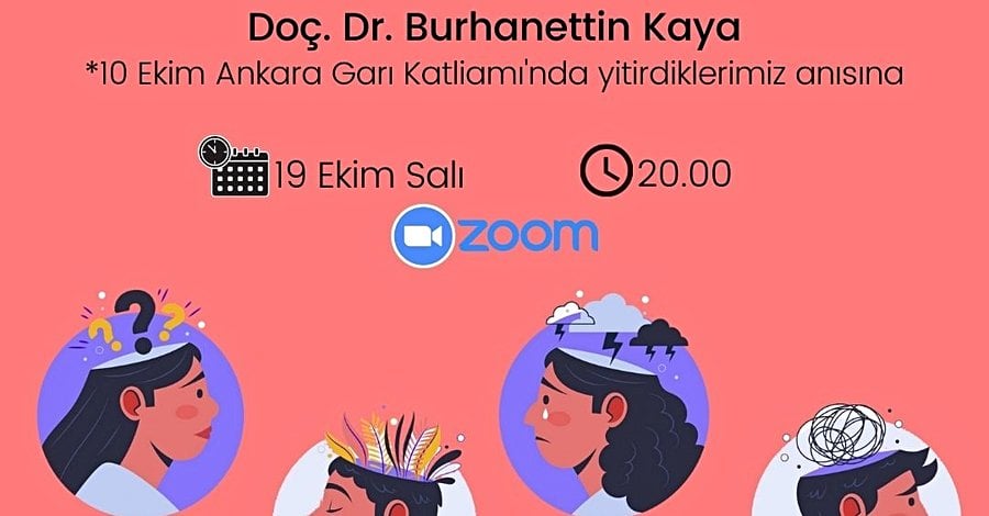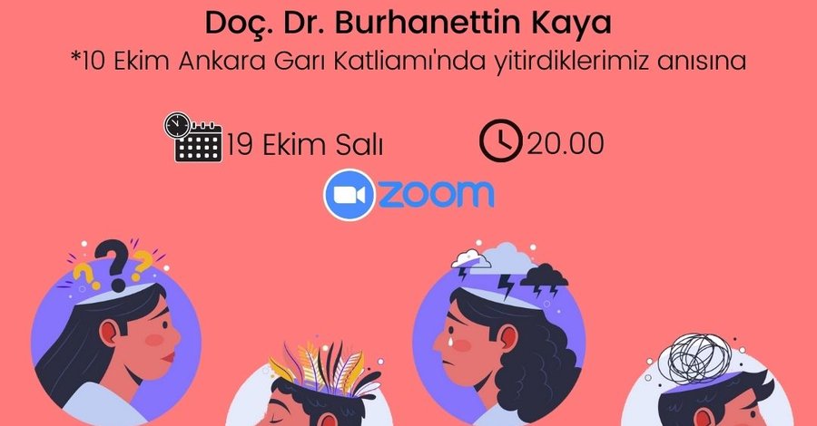 19 Ekim Salı akşamı saat 20.00'de Doç. Dr. Burhanettin Kaya ile birlikte Ruhsal Travmalar üzerine konuşacağız. Etkinlik bağlantısı etkinlik günü duyuru gruplarımız üzerinden paylaşılacaktır.
