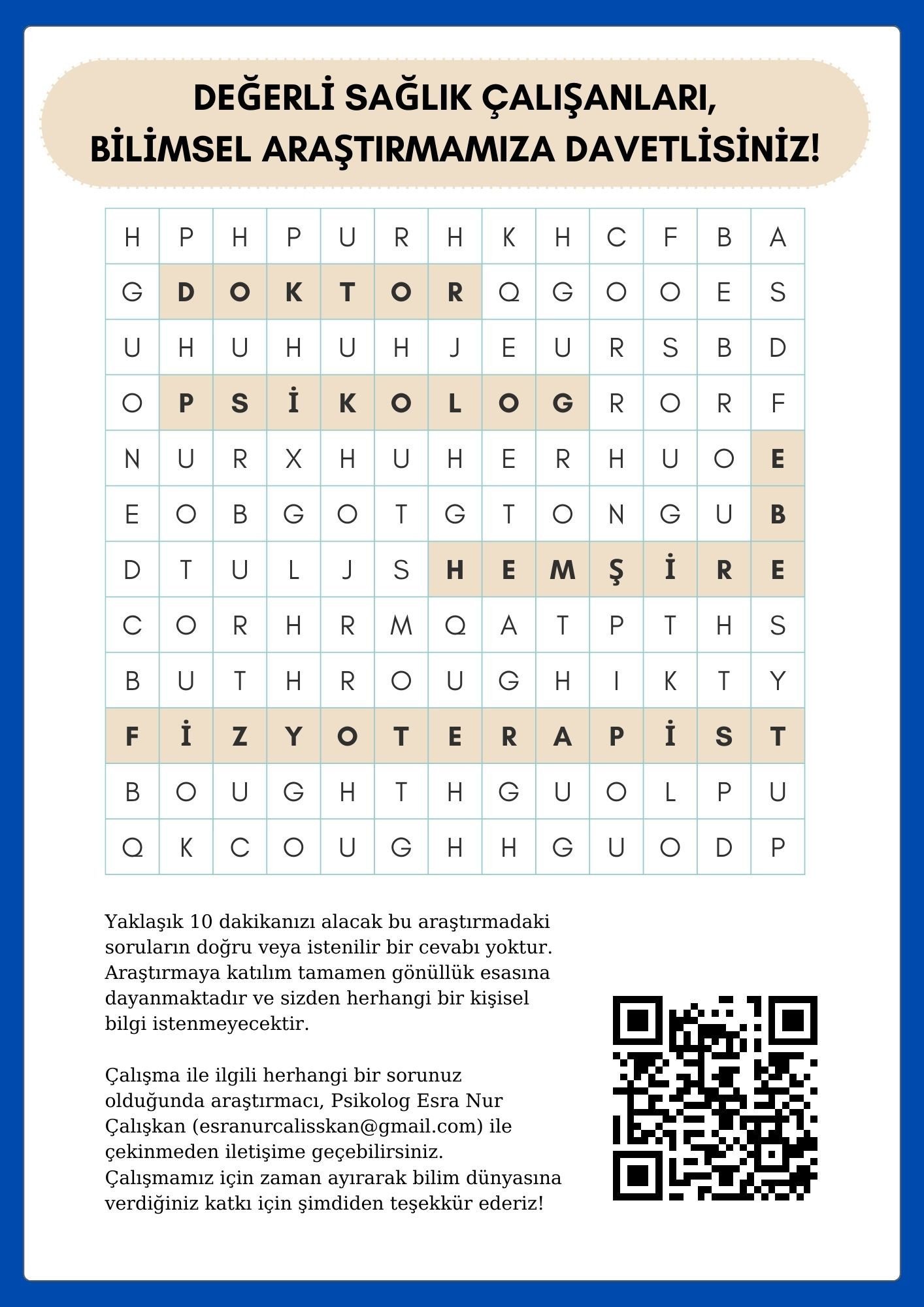 Çalışma ile ilgili herhangi bir sorunuz olduğunda araştırmacı, Psikolog Esra Nur Çalışkan ([email protected]) ile çekinmeden iletişime geçebilirsiniz.
