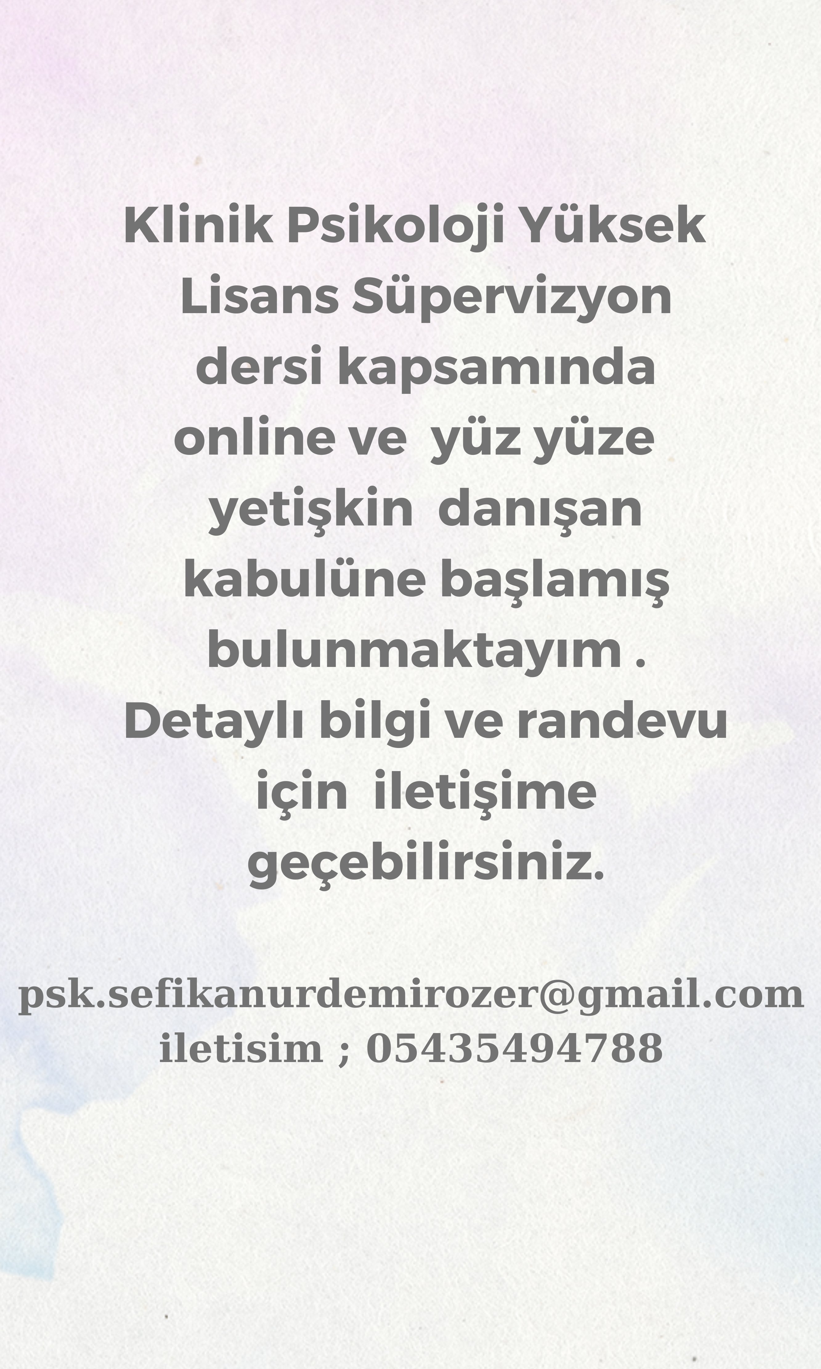 Herkese merhaba, ben Psikolog Şefika Nur Demirözer. İstanbul Sabahattin Zaim üniversitesi klinik psikoloji yüksek lisans Süpervizyon dersi kapsamında terapinin ulaşılabilir olması adına uygun ücretli online terapi vermekteyim.