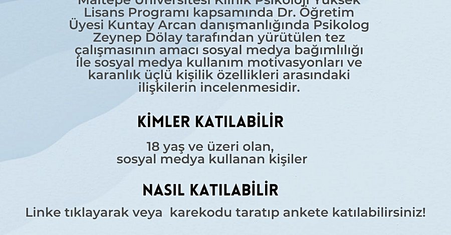 Maltepe Üniversitesi Klinik Psikoloji Yüksek Lisans Programı kapsamında yürüttüğüm tez çalışması için 18 yaş ve üzeri katılımcılara ihtiyacım var. Anketi doldurmak tahminen 10 dakika sürüyor. Anketi doldurarak ve paylaşarak destek olabilirseniz çok sevinirim.