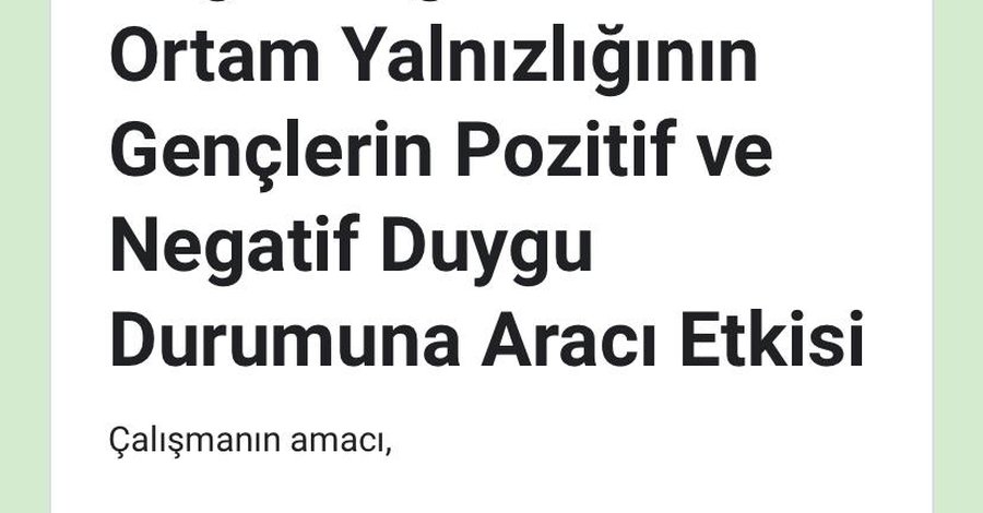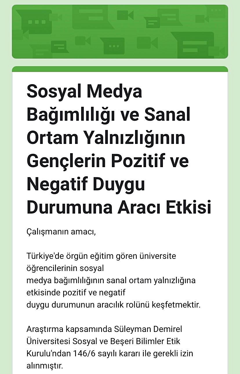 Türkiye'de örgün eğitim gören üniversite öğrencilerinin sosyal medya bağımlılığının sanal ortam yalnızlığına etkisinde pozitif ve negatif duygu durumunun aracılık rolünü keşfetmektir.
