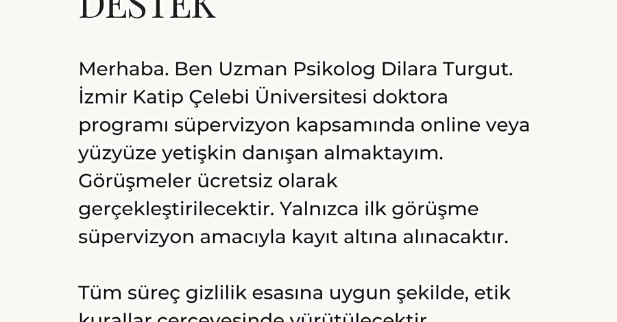 Ben Dilara Turgut. Ege Üniversitesi Psikoloji bölümü lisans mezunuyum. Yüksek lisansımı İzmir Katip Çelebi Üniversitesi'nde tamamladım ve halihazırda klinik psikoloji doktora eğitimime devam etmekteyim. Ders kapsamında süpervizyon altında göreceğim yetişkin danışan almaktayım.