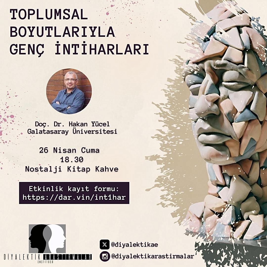 Bu hafta Cuma günü gerçekleşecek etkinliğimizde “son günlerde giderek yaygınlaşan genç intiharlarını toplumsal boyutlarıyla konuşmak üzere” Galatasaray Üniversitesi Siyaset Bilimi bölümünden Hakan Yücel ile bir araya geliyoruz.